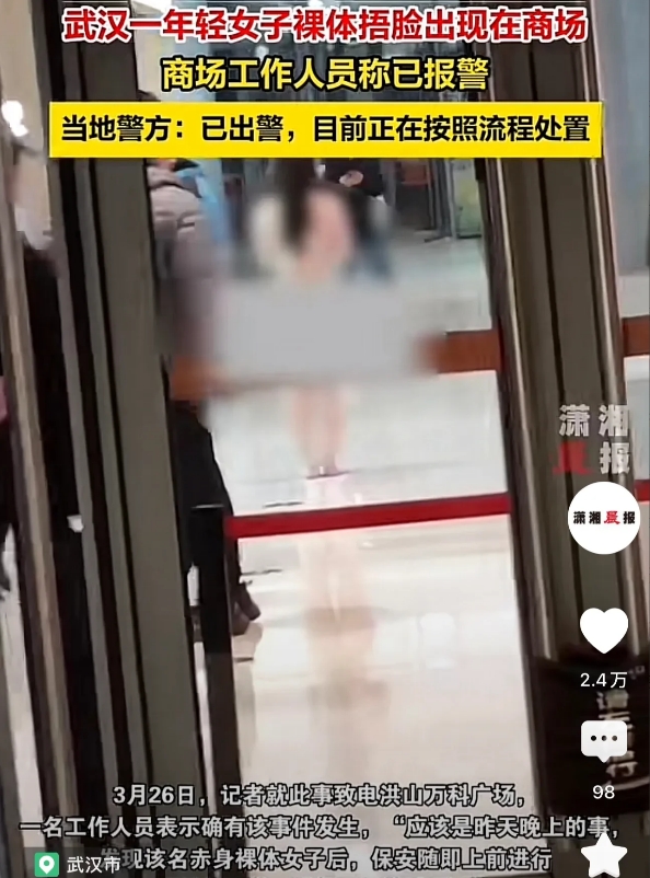 湖北武汉,在一处购物广场,一名年轻的女子突然裸身站在商场内,时而捂着脸向行人靠近,时而趴在商场的咨询台处,引起商场内行人的侧目,事发后,保安见状立即上前进行了阻拦并遮挡,随后便报了警,很快警方就来到现场对此事进行调查。