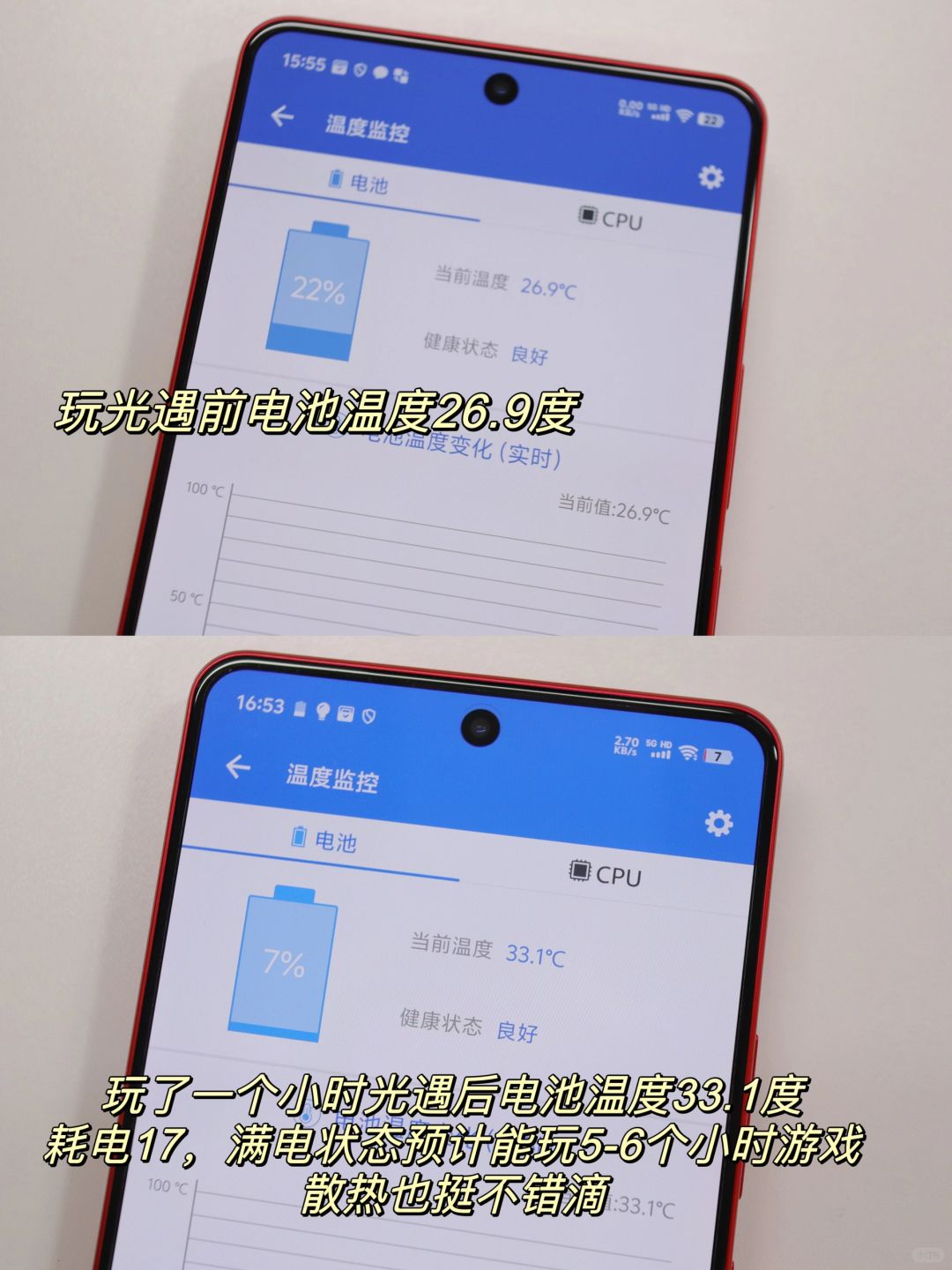 玩光遇前电池温度26.7,光遇1小时后电池温度33.1,散热不错~