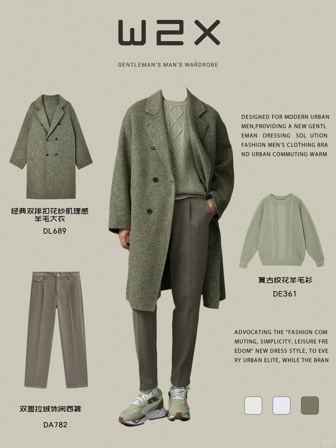 相比于千篇一律的黑白灰大衣,拥有一件有辨识度,清雅般白月光冬日大衣,怎么能让人拒绝呢~ 花纱肌理感,松软细腻的绒感,垂顺的筋骨感摇曳有质感,上身飘逸且自带氛围感 -关于搭配建议收藏: 🔸LOOK1:橄榄绿双排扣羊毛大衣+白色高领针织衫+米白仿灯芯绒休闲裤 🔸LOOK2:橄榄绿双排扣羊毛大衣+复古绞花果绿套头羊毛针织衫+茶咖磨毛感休闲西裤 🔸LOOK3:高级灰双排扣羊毛大衣+黑色高领针织衫+黑色磨毛感休闲西裤