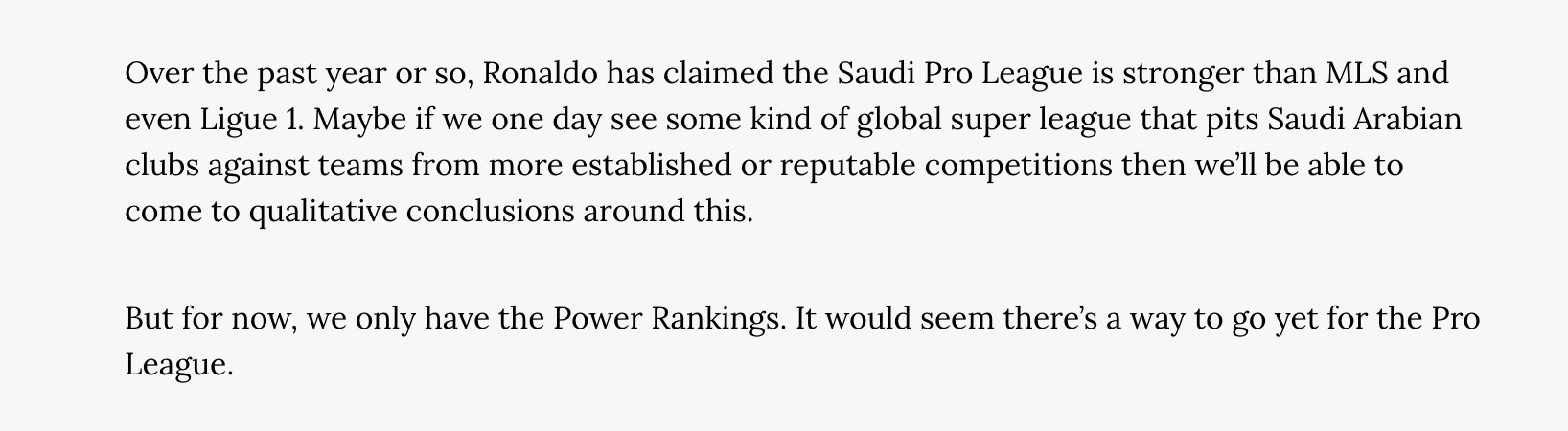 在过去一年左右时间里,C罗说沙特联赛比美职联甚至法甲更强。也许有天我们看到某种全球超级联赛,让沙特球队和来自更成熟赛事的球队进行对抗,我们将能够就此得出结论。