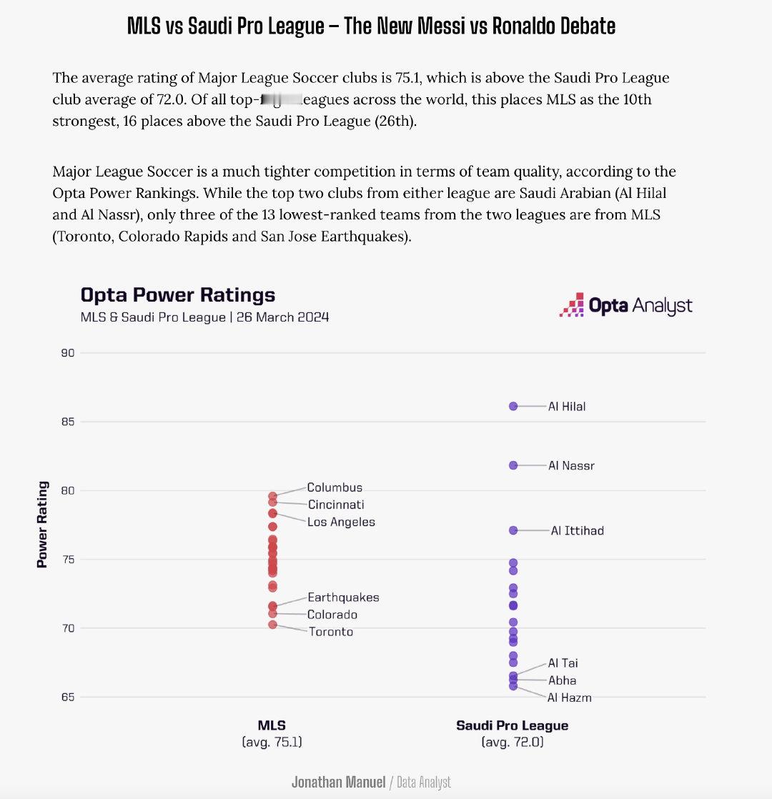 根据OPTA实力排名,就球队质量而言,美职联竞争要激烈得多。虽然美职联、沙特联赛两个联赛排名前两位的都是沙特球队(利雅得新月、利雅得胜利),但两个联赛中排名最低的13支球队只有3支来自美职联(多伦多、科罗拉多急流和圣何塞地震)。