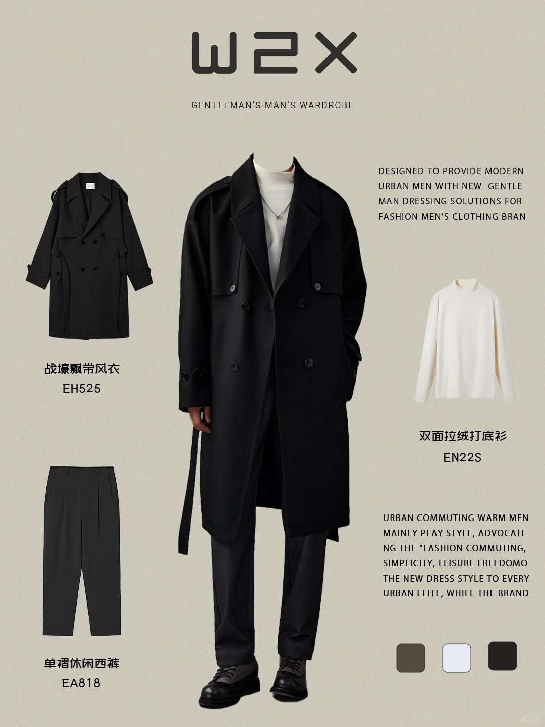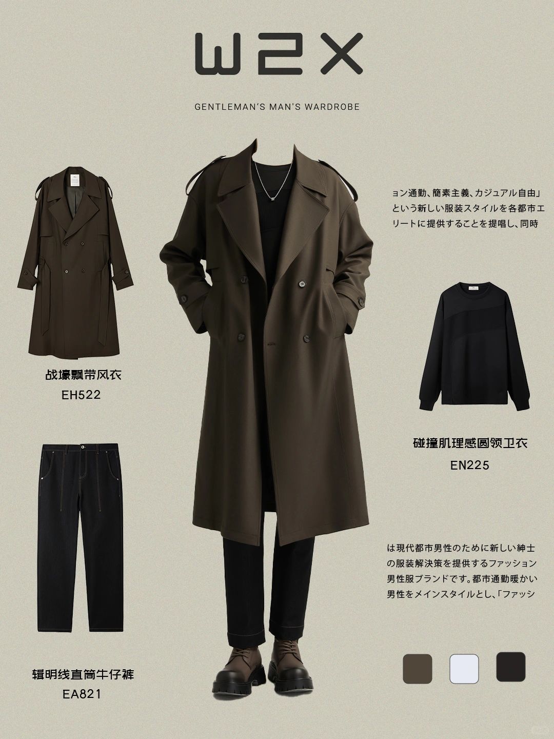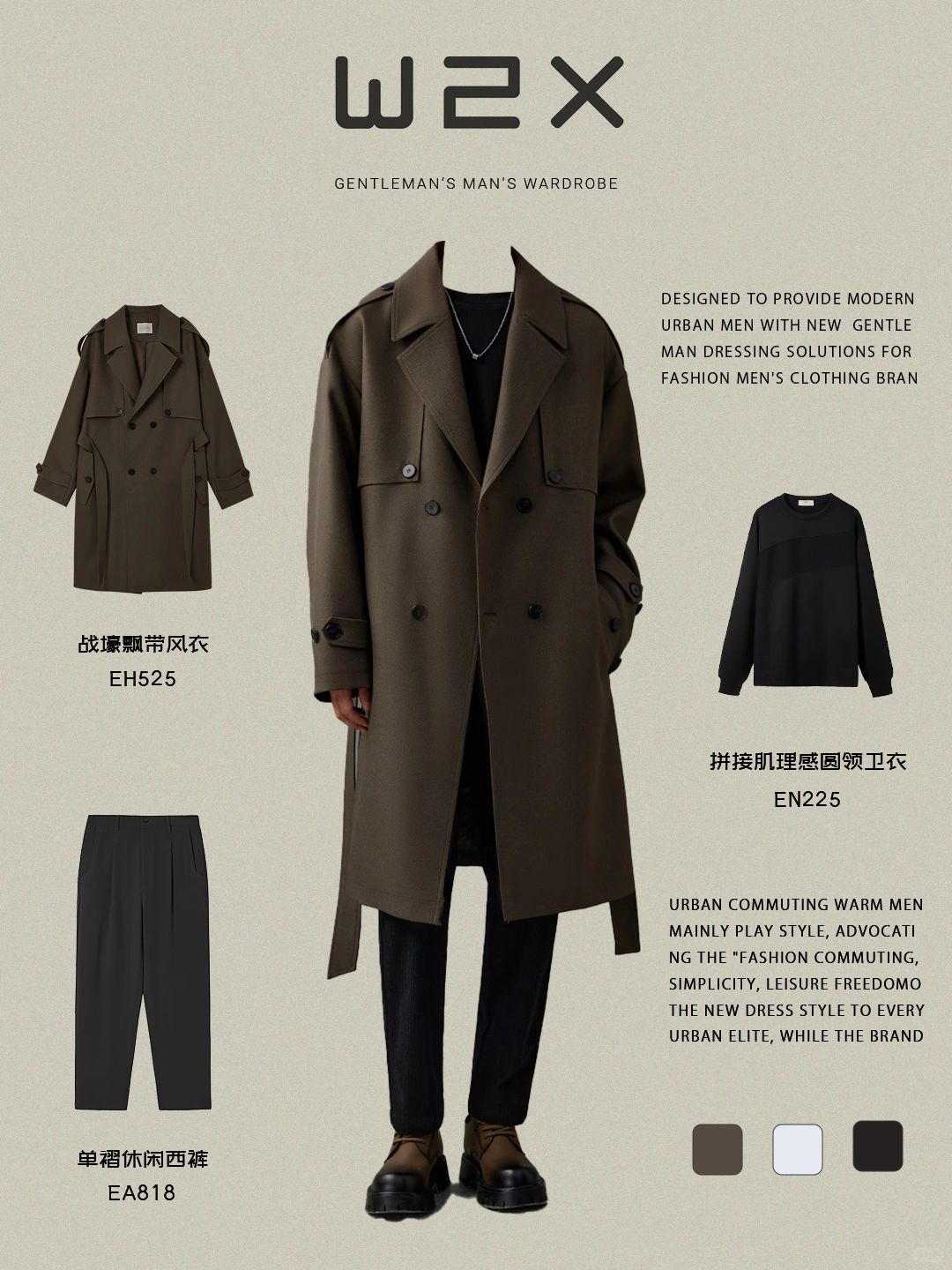 🟤棕色肩章战壕飘带风衣+黑色拼接卫衣+黑色垂感西裤