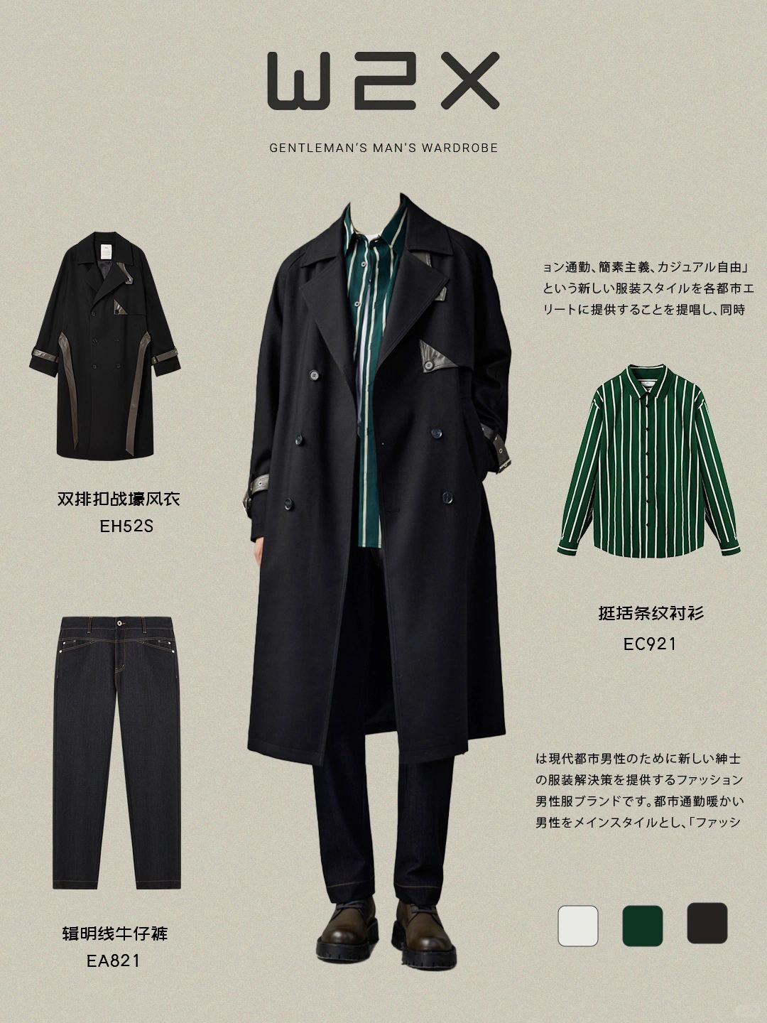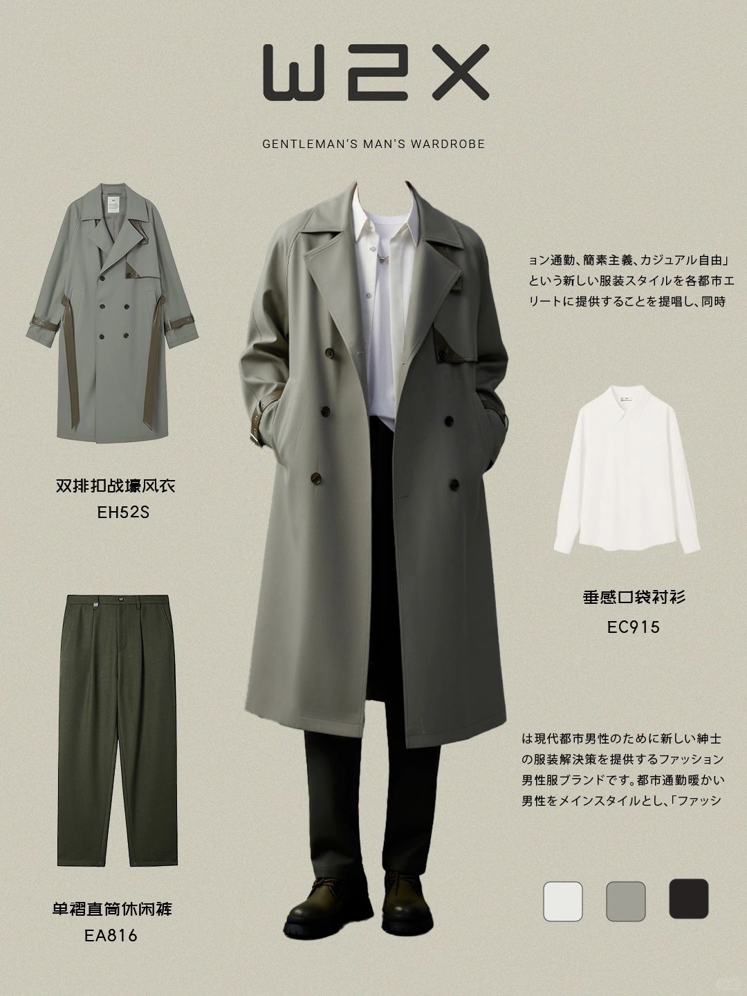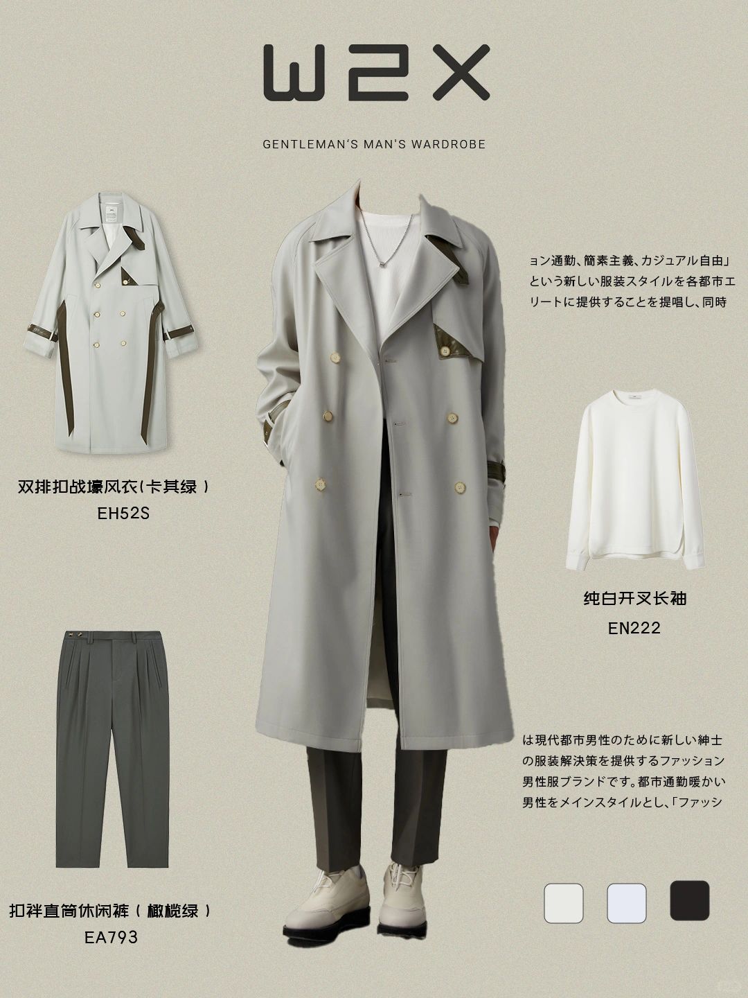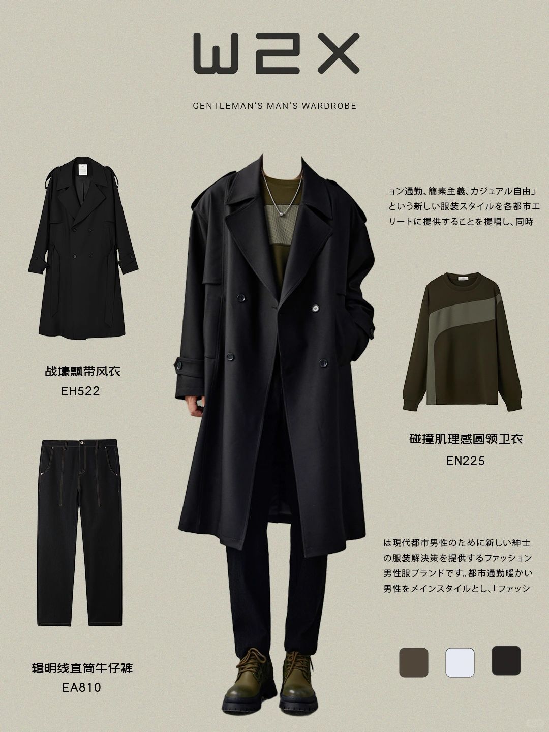 🟤棕色肩章战壕飘带风衣+黑色拼接卫衣+黑色垂感西裤