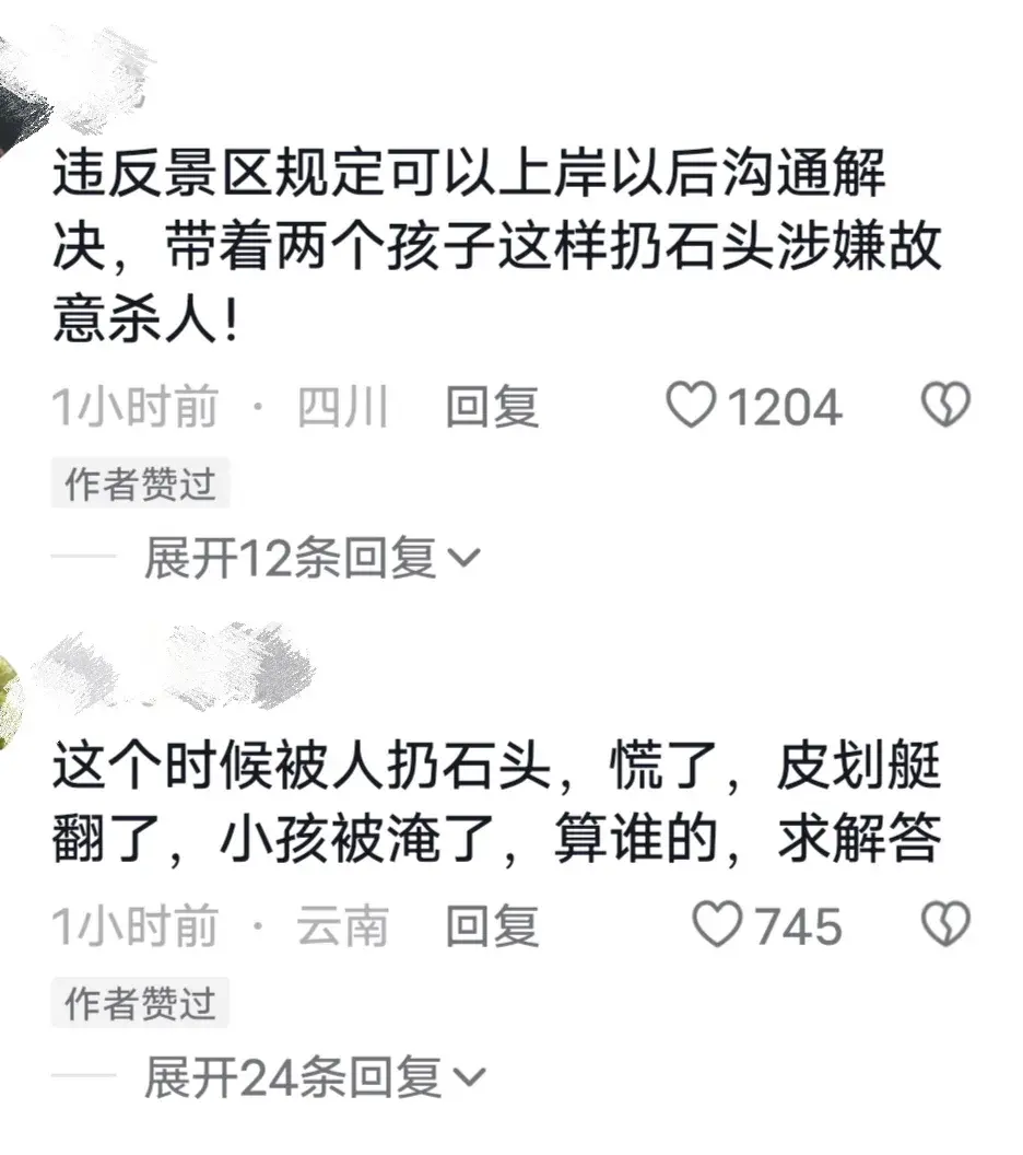 太可怕了!男子自带皮划艇带娃游玩,遭四名自称“景区工作人员”岸边扔石头!