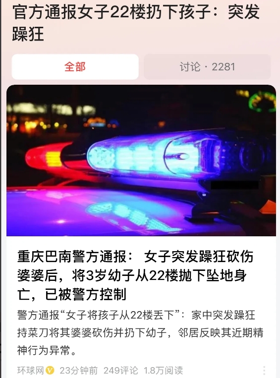重庆巴南,网传一名女子疑因与婆婆发生争执后,故意将一名3岁小孩从22楼扔至楼下。目前,当地公安机关发布通报称,孩子没有生命危险、正在医院抢救中、女子已经被警方控制,亲属和邻居反映女子近期精神行为异常。案件正在进一步侦办中。