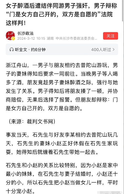 浙江舟山,一男子和妻妹等朋友一起去普陀山游玩,当晚大家一起喝酒助兴,随后,朋友和男子妻妹发生了关系,男子得知后,觉得无脸面对妻子,处于义愤将朋友打了一顿并要求赔偿,无果后,男子选择了报警求助,谁知,朋友却辩解称门是对方自愿开的。法院:开门是自愿,难道开门就意味着自愿发生关系?