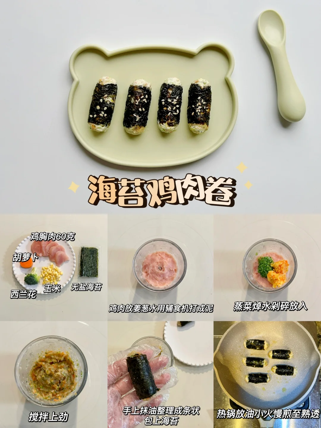👶🏻: 11个月+24天 🍼:8:00:210奶 ⏰:12:00午餐 🍱: 茄子肉沫拌饭 🤏:海苔鸡肉卷 🍼:2:00:180奶 ⏰:17:30晚餐 🍲:茄汁鸡蛋鳕鱼盖浇面 🍼:20:30:180奶(睡前) 🌟分享11月龄宝宝一天辅食,教程都在图片上喔~ 茄子肉沫跟饭一拌,就不存在饭渣宝宝,敲下饭~[哇R] 海苔鸡肉卷不止亿点点好吃,麻麻们快做起来吧[斜眼R] 皮皮会走路之后运动量上来了,一天的辅食量也安排得满满当当的,吃嘛嘛香,身长曲线也很好,但老母亲的工作也上来了[doge]