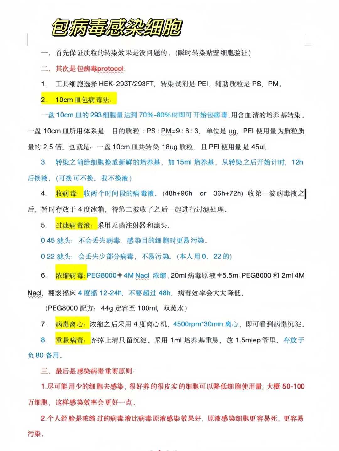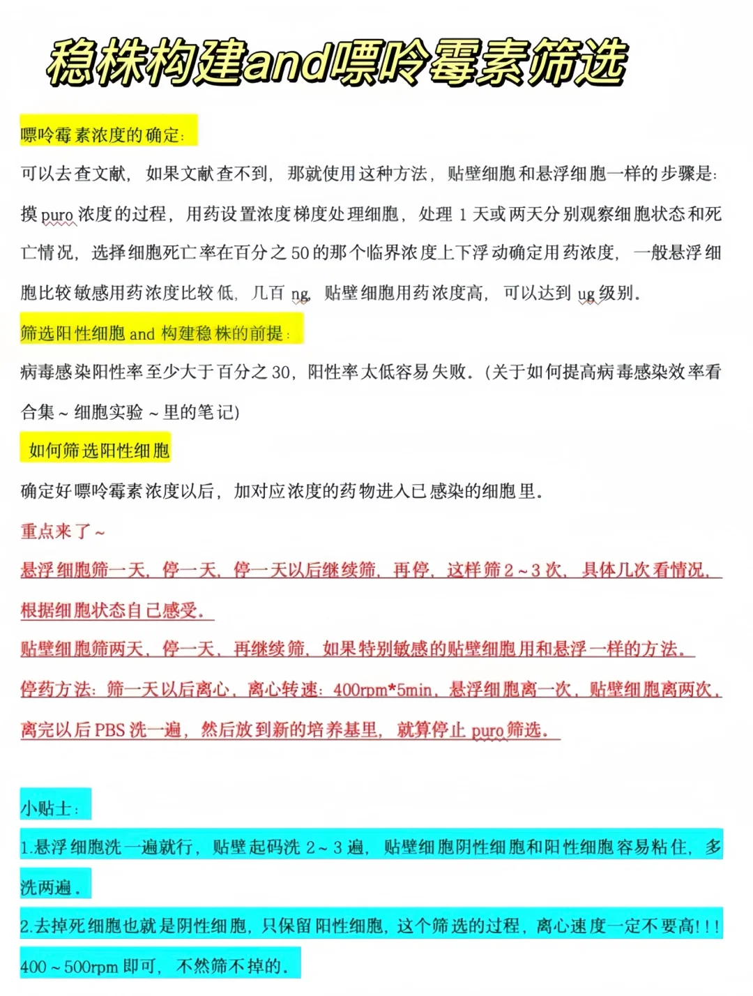 🫡这篇笔记包括慢病毒包装protocol和注意事项,慢病毒感染细胞tips,以及构建稳株和嘌呤霉素筛选tips。