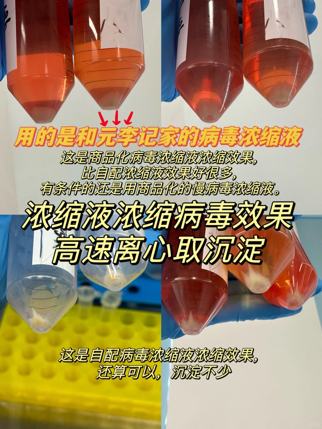 🧫用的同样的细胞,同样的质粒做的病毒,和元李记浓缩出来的病毒沉淀比自配的病毒浓缩液多挺多。