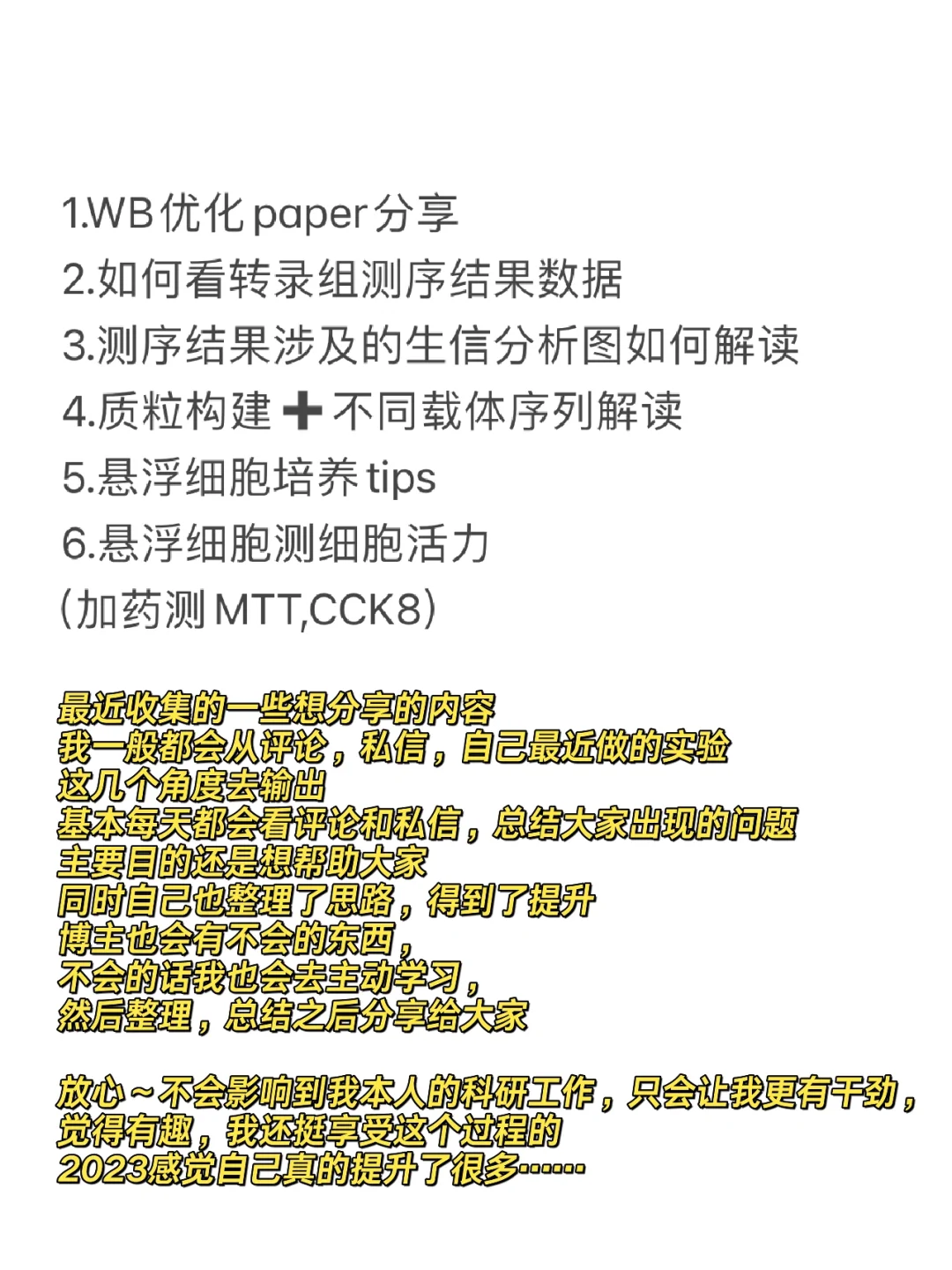 今年马上就结束啦,快收尾回家了嘿嘿😁 最近就养养细胞了临走前冻起来,感觉每次放假的前后一周都做不了什么重要的实验。[萌萌哒R] 但我也没闲着,最近收集的一些想分享的内容,并且都整理好了,一直都在持续整理…等来年开学再慢慢输出给大伙儿吧,大过年的就不提科研了,我也不想提…[偷笑R] 我一般都会从评论,私信,qun消息,自己最近做的实验,这几个角度去输出。 (哦对提一嘴,最近新搞了一个wb答疑qun,仅限wb实验哦,可以在qun里发自己遇到的条带问题,我看到也会给大家🆓答疑的!想进的直接进) 基本每天都会看大家的评论和私信,但可能不会都看,总结大家出现的问题,想看哪些实验,以往的分享也是这样子。 主要目的还是帮助,同时自己也整理了思路,得到了提升!! 博主也会有不会的东西,毕竟我也只是一个学生,不会的话我也会去主动学习,然后整理,总结之后分享给大家。 放心~不会影响到我本人的科研工作,只会让我更有干劲,觉得有趣,我还挺享受这个过程的,肯定是在自己精力范围内做一些事情。 2023感觉自己真的提升了很多,内核也更加强大了,情绪也越来越稳定了不会因为一时的阴性结果而影响到自己的心情,或者感觉特别有压力,虽然有时候还会发疯… 这一年也发生了很多事情,从2023年开始分享科研日常,收获了不少,无论是精神上还是课题项目上,总的来说这一年是比较顺利的,感谢2023年的自己,也感谢2023年无数科研人的网络陪伴~[哭惹R] 现在分享莫名有了一种责任感哈哈哈,不想辜负大家的关注,这其实是我今年得到提升的很大原因吧,有责任感就有动力,有动力就想去学习,去吸收,去思考…(谁能想到一个博士生读博的一半动力是来源于网友啊…) 提前祝大家新年快乐🎉,新年那天我可能会抽奖发🧧哦!!!![偷笑R][萌萌哒R][自拍R] (别人宠粉,我也来搞搞) 2024继续加油!!!!希望2024我和各位研究生的科研都顺利!!!