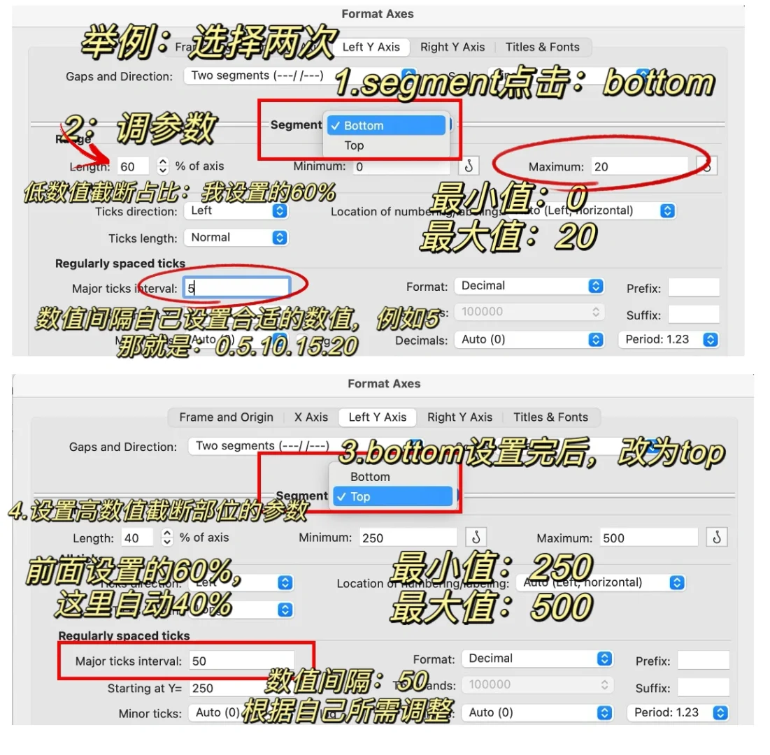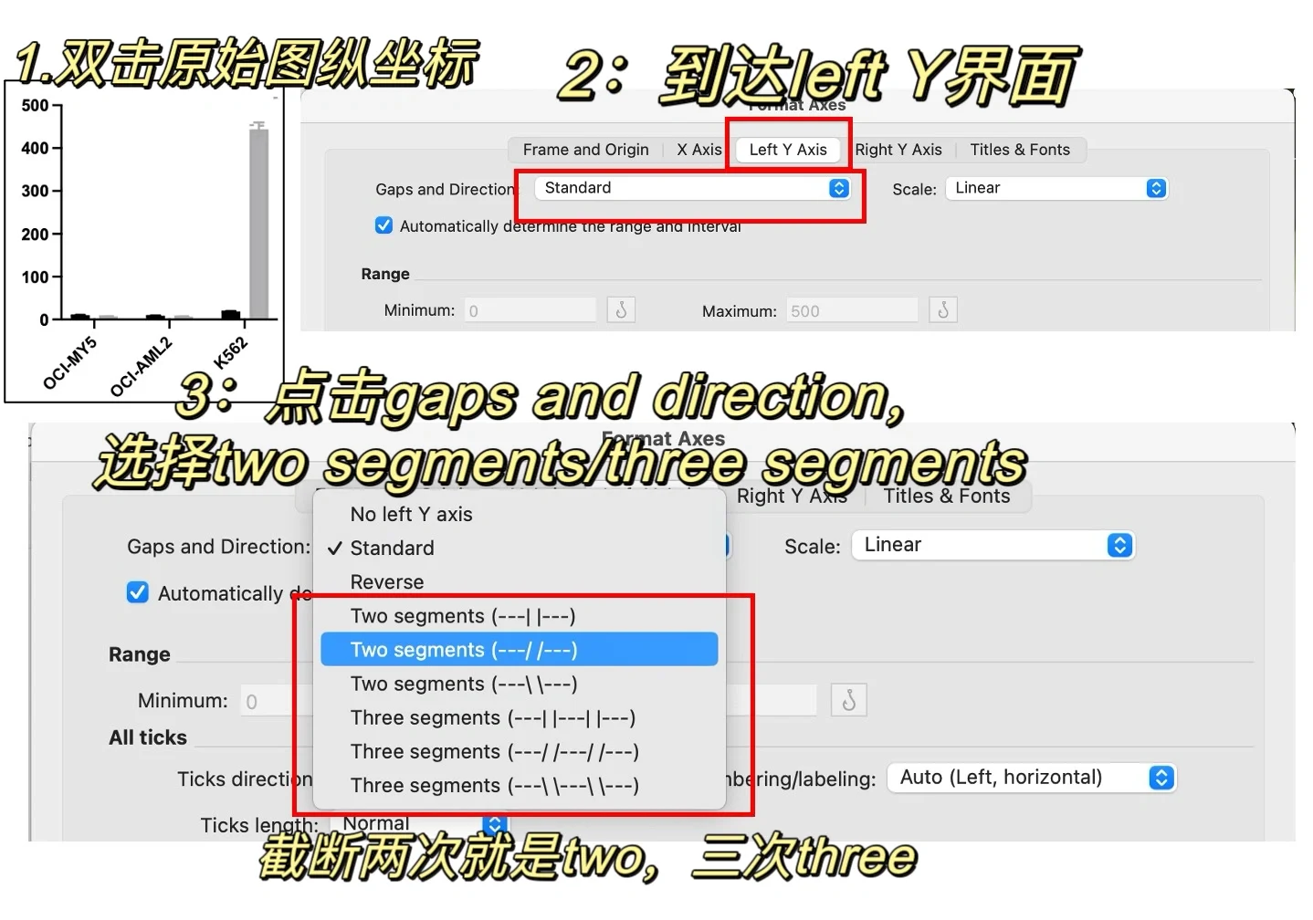 我这里做的是测药物IC50值,不同的细胞系对于药物的敏感性差距太大,图上做的是药物IC50的柱状图,两个细胞IC50400,差距太大。 如果数值差距太大的话,直接做普通柱状图其实看起来会很别扭不舒服,一个几乎没有,一个特别高,这时候需要优化,一般采用纵坐标中间断层的柱状图。 如图所示:prism绘制截断柱状图,以及主要设置哪些参数~