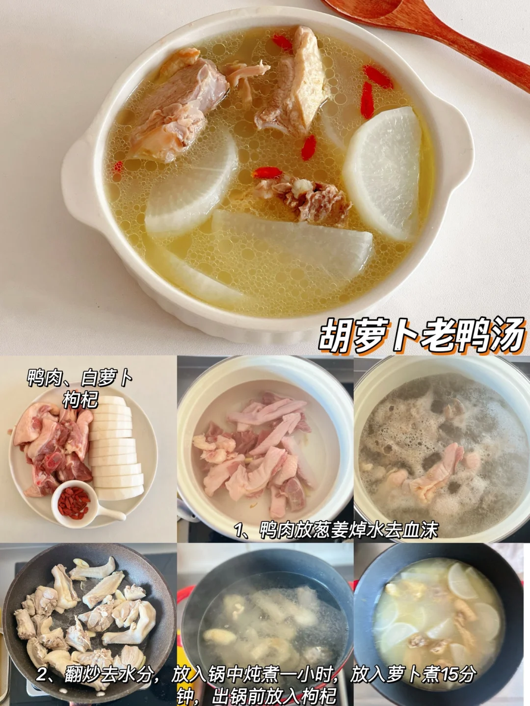 制作:鸭肉焯水去血沫,锅中放入姜蒜翻炒鸭肉变色炒干,倒入锅中,加入适量的水,炖煮1小时后加入白萝卜煮20分钟,出锅前放入枸杞葱花和调味品