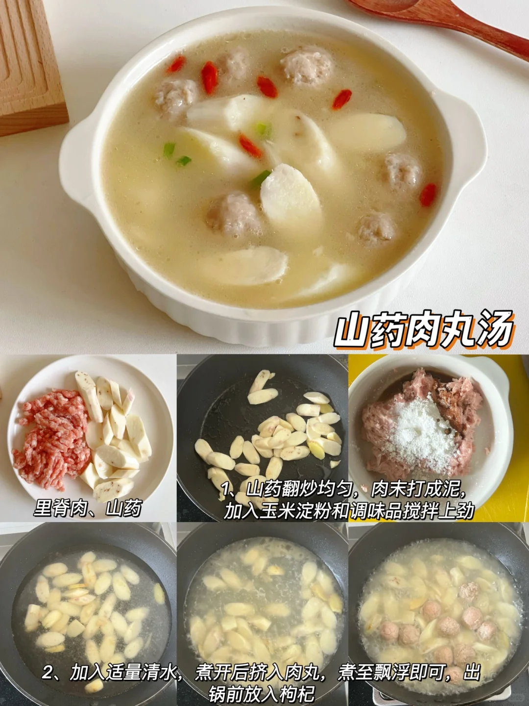 制作:山药翻炒片刻,加入清水煮15分钟,猪肉打成泥,加入玉米淀粉和调味品搅拌上劲,水开放入丸子,煮至飘起,出锅前放入枸杞,葱花即可
