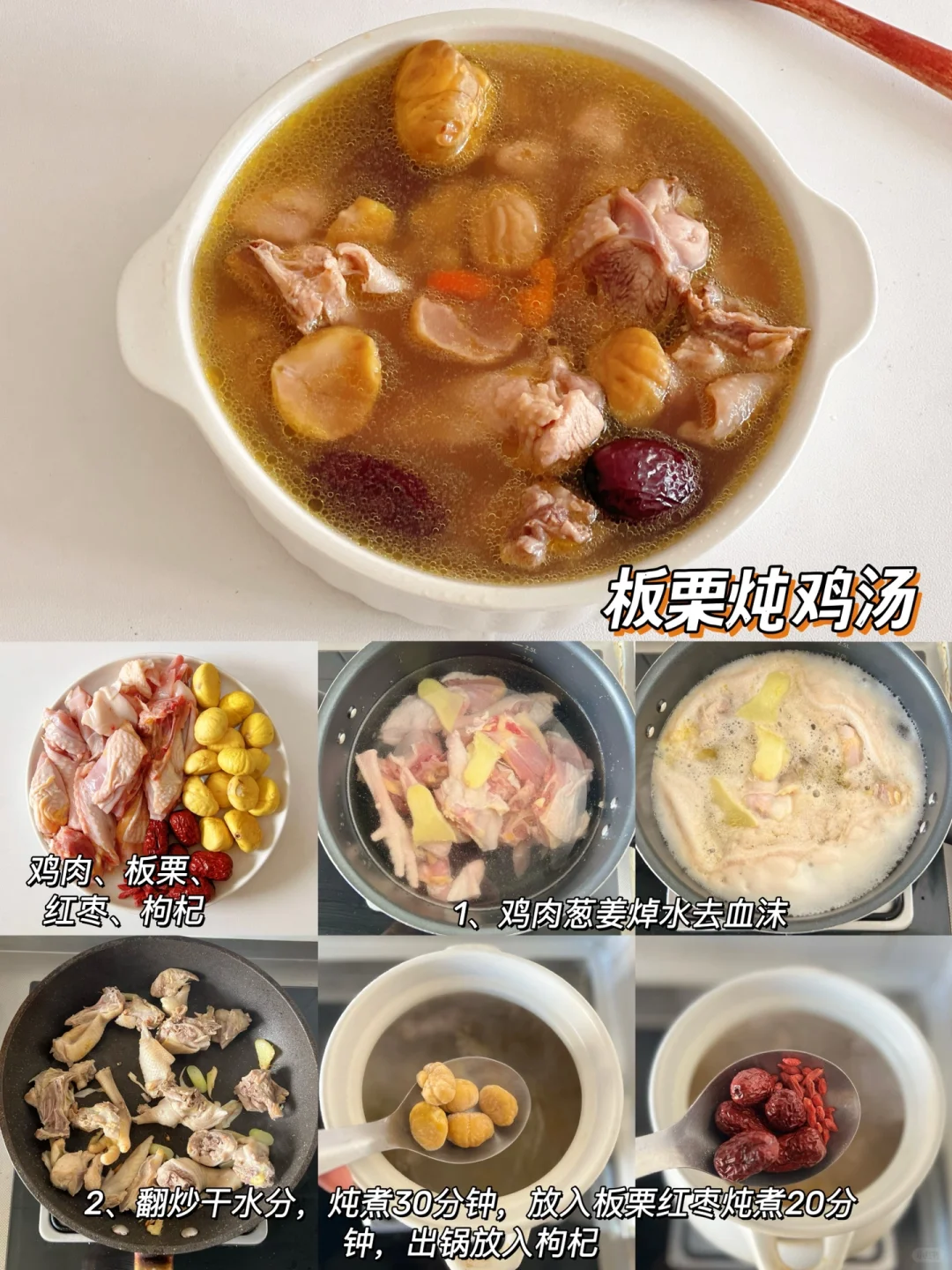 制作:鸡肉焯水去血沫,锅中放入姜蒜翻炒变色,倒入炖锅中加入适量水,炖煮40分钟,加入板栗枸杞红枣煮20分钟即可