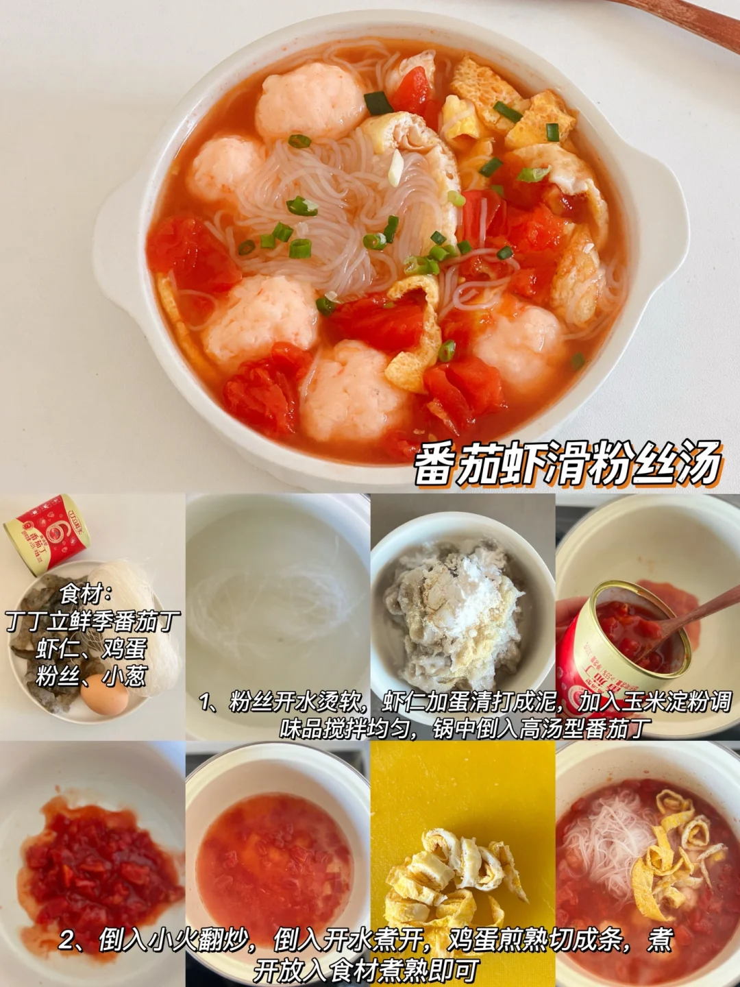 制作:粉丝烫软,鸡蛋煎熟切成条,锅中加入适量高汤型番茄丁,加入开水煮开,挤入虾滑,放入粉丝、鸡蛋,调味品,最后出锅前放入葱花即可