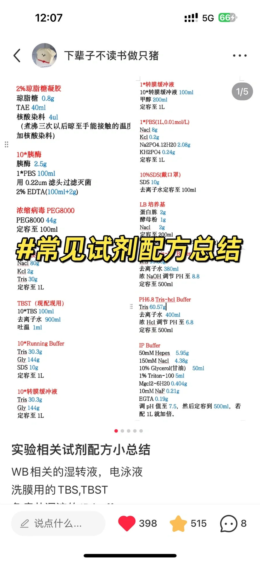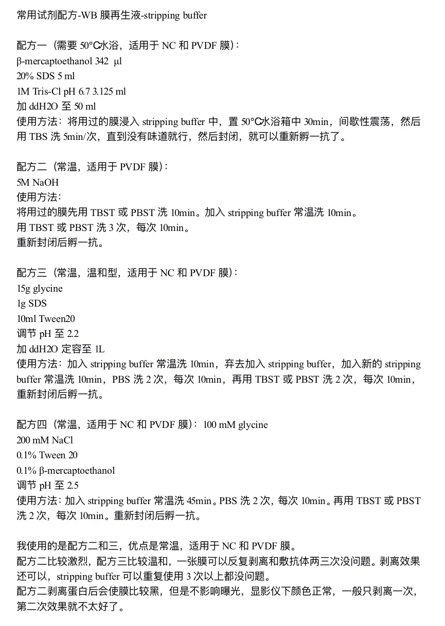 🎓配方一(50℃水浴,适用于NC和PVDF膜): β-mercaptoethanol 342 μl 20% SDS 5 ml 1M Tris-Cl pH 6.7 3.125 ml 加ddH2O至50 ml 使用方法:将用过的膜浸入stripping buffer中,置50℃水浴箱中30min,间歇性震荡,然后用TBS洗5min/次,直到没有味道就行,然后封闭,就可以重新孵一抗了。 🎓配方二(常温,适用于PVDF膜): 5M NaOH 使用方法: 将用过的膜先用TBST或PBST洗10min。加入stripping buffer常温洗10min。 用TBST或PBST洗3次,每次10min。 重新封闭后孵一抗。 🎓配方三(常温,温和型,适用于NC膜和PVDF膜): 15g glycine 1g SDS 10ml Tween20 调节pH至 2.2 加ddH2O定容至1L 使用方法:加入stripping buffer常温洗10min,弃去加入stripping buffer,加入新的stripping buffer常温洗10min,PBS洗2次,每次10min,再用TBST或PBST洗2次,每次10min,重新封闭后孵一抗。 🎓配方四(常温,适用于NC和PVDF膜): 100 mM glycine 200 mM NaCl 0.1% Tween 20 0.1% β-mercaptoethanol 调节pH至 2.5 使用方法:加入stripping buffer常温洗45min。PBS洗2次,每次10min。再用TBST或PBST洗2次,每次10min。重新封闭后孵一抗。 我使用的是配方二和三,优点是常温,适用于NC和PVDF膜。配方二比较激烈,配方三比较温和,一张膜可以反复剥离和敷抗体两三次没问题。剥离效果还可以,stripping buffer可以重复使用3次以上都没问题。配方二剥离蛋白后会使膜比较黑,但是不影响曝光,显影仪下颜色正常,一般只剥离一次,第二次效果就不太好了。 分享给大家。[喝奶茶R] 之前还出过很多别的常用试剂配方,大家可以去翻看自行保存