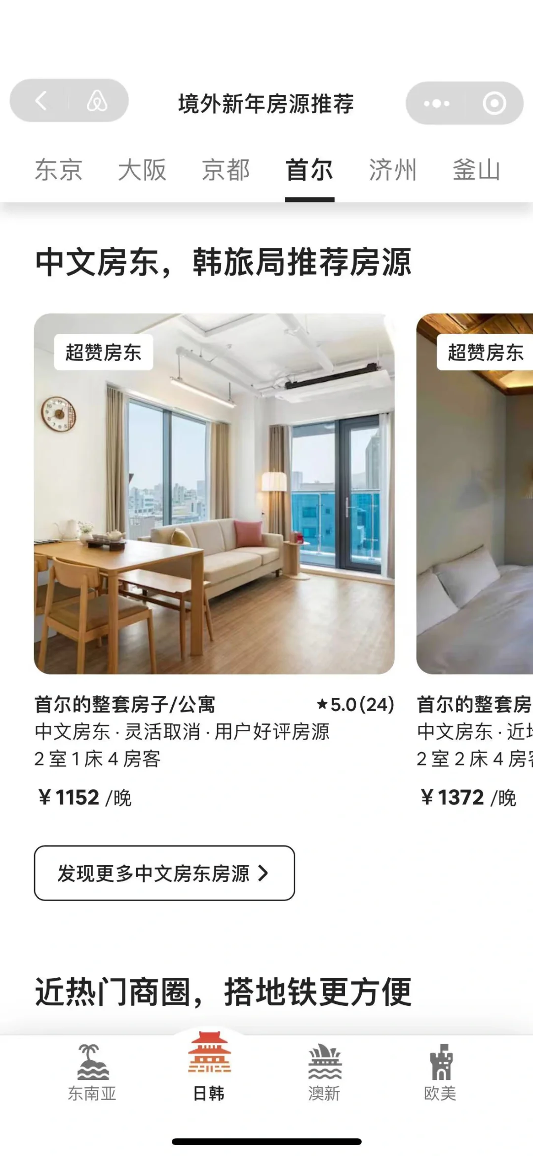 韩国的住宿推荐住民宿,能更有烟火气地体验到韩国旅行,我一般会去到ABB上预订民宿,上面有韩旅局推荐的民宿!好看不踩雷~