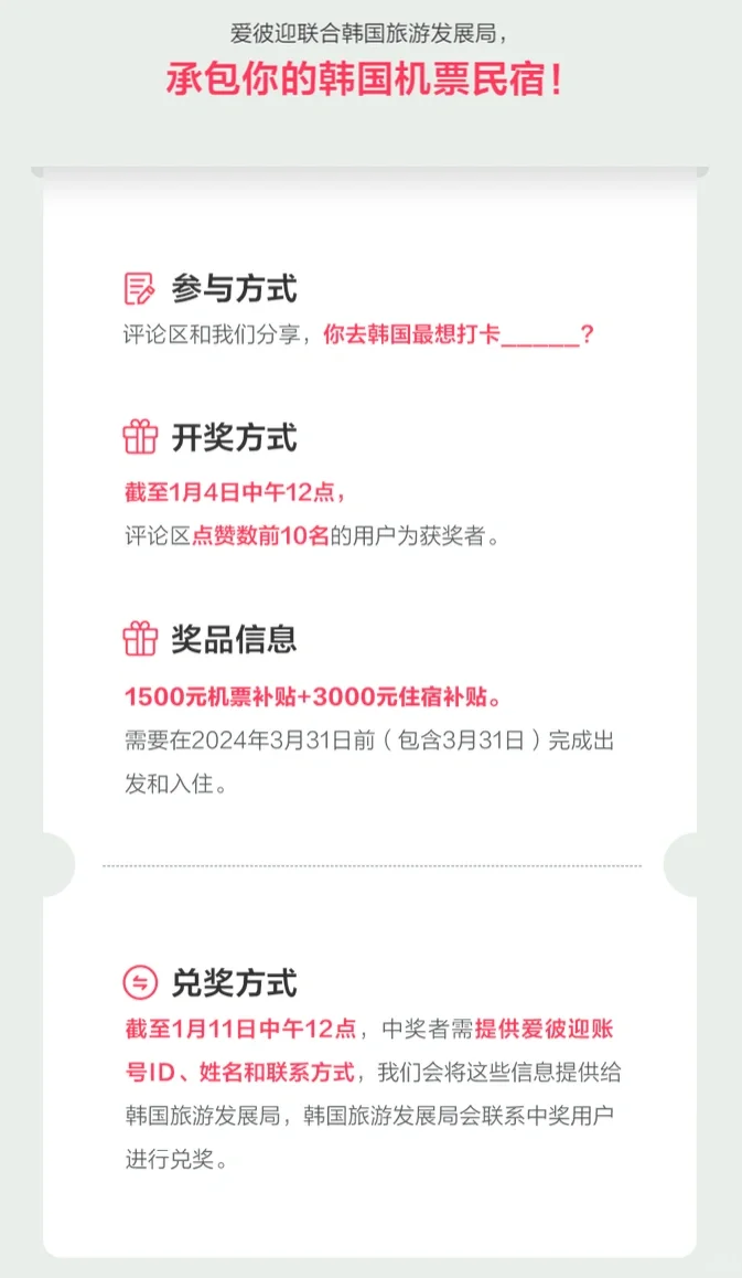 说了那么是不是也想去韩国了呢?还在担心机票和酒店?现在送上福利啦!前往【爱/彼/迎】VX公号里12月28日发布的文章中参与抽奖,评论区参与评论,你去韩国最想打卡___? ,将以抽奖的方式送出1500元的机票补贴+3000元住宿补贴,还不快冲!