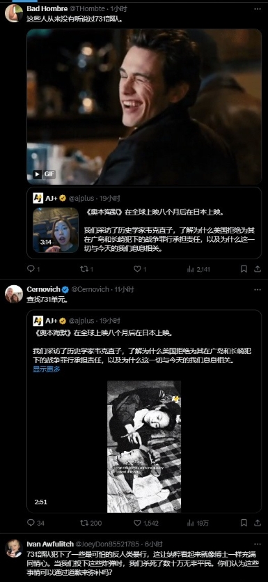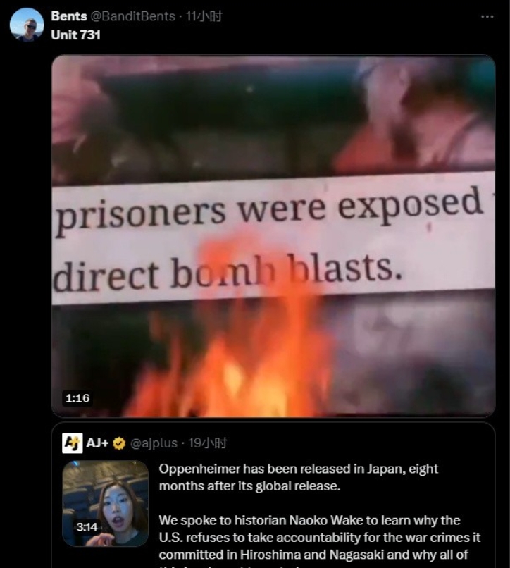 “父慈子孝”的美日掐起来了!臭名昭著的731部队上了美国热搜(见图2),你敢信?731上榜的原因是,《奥本海默》在日本上映后,日本人拍了个要求美国人反省“投下原子弹的战争罪行”的视频,然后美国人开始转发各种各样关于731部队的tiktok视频。