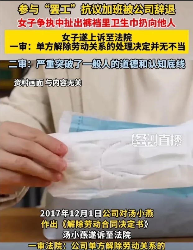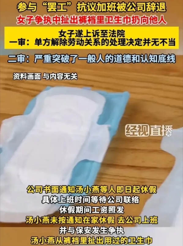公司认为,汤小燕将卫生巾扔向保安,违反了公司的规章制度,所以据此与之解除劳动关系。法院认定是合法的。(文中姓名皆为化名)