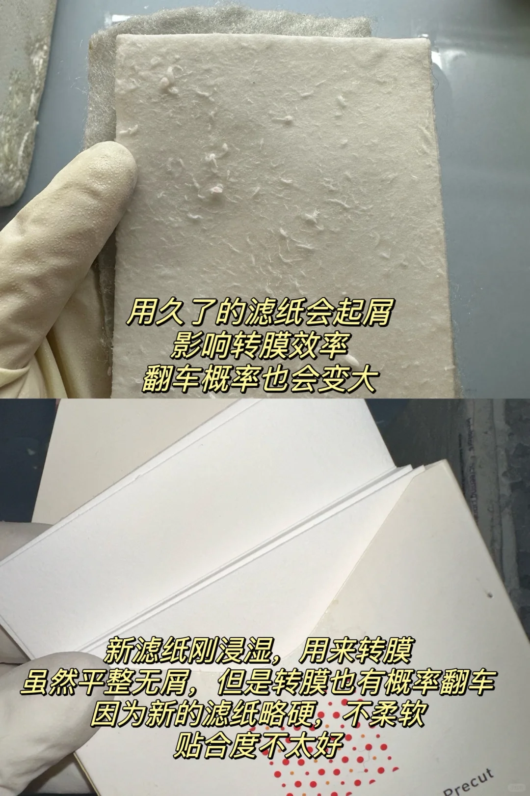 之前我也用滤纸,如图所示,用的多了会起屑,起屑后不平整,如果还用的话坑坑洼洼就很容易翻车尤其是新手,而且会弄脏转膜液,转膜液回收次数也变少。除此之外,特别新的滤纸(也就是新滤纸刚浸湿前几次转膜)也容易翻车,新滤纸就算浸湿也是硬硬的感觉,贴合性不是很好,总之:太新和太旧的滤纸都可能会翻车…