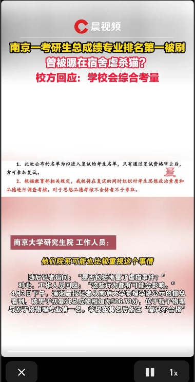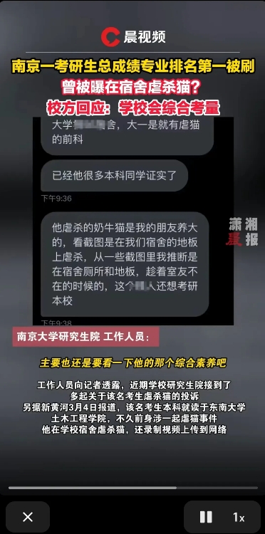 江苏南京,一名男子报考南京大学的粒子物理与原子核物理研究生,初试和复试的总成绩为506.78分,位于第一名,却没有大学被录取。原来该男子本科就读于东南大学,曾经在学校宿舍虐杀猫,并且上传视频。当时公安机关对其进行了批评教育。现在男子在公示时间,被多人举报,最后因为道德品质不过关,没有被南京大学录取。要说真的是咎由自取了!