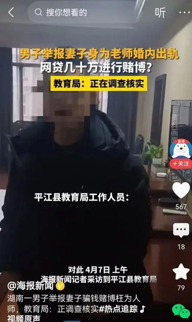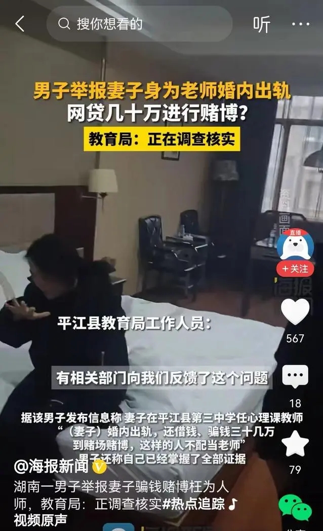 湖南岳阳,一男子在酒店房间抓住出轨的妻子后,发视频实名举报身为人民教师的妻子,婚内出轨、骗取他人钱财、贷款几十万赌博、枉为人师!目前,当地教育局工作人员回应称,仍在调查核实中。