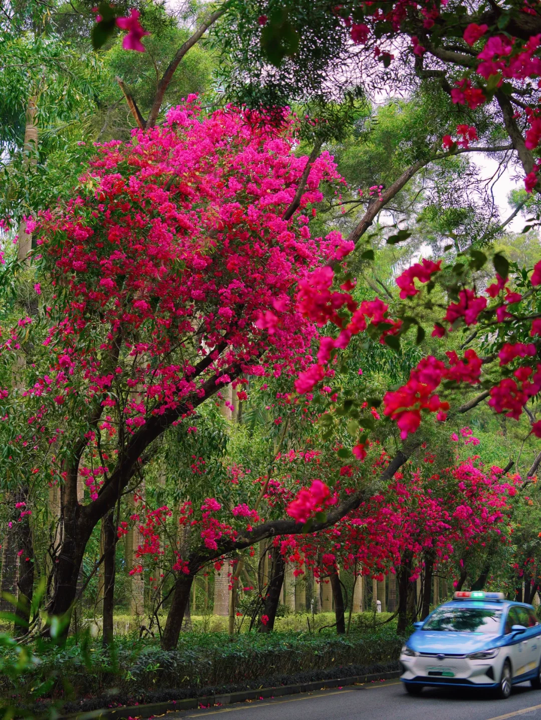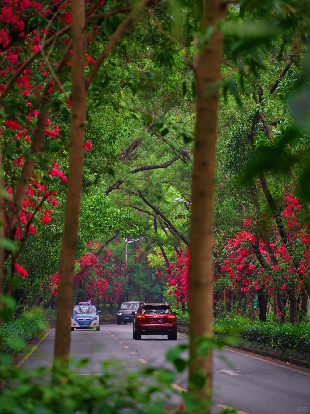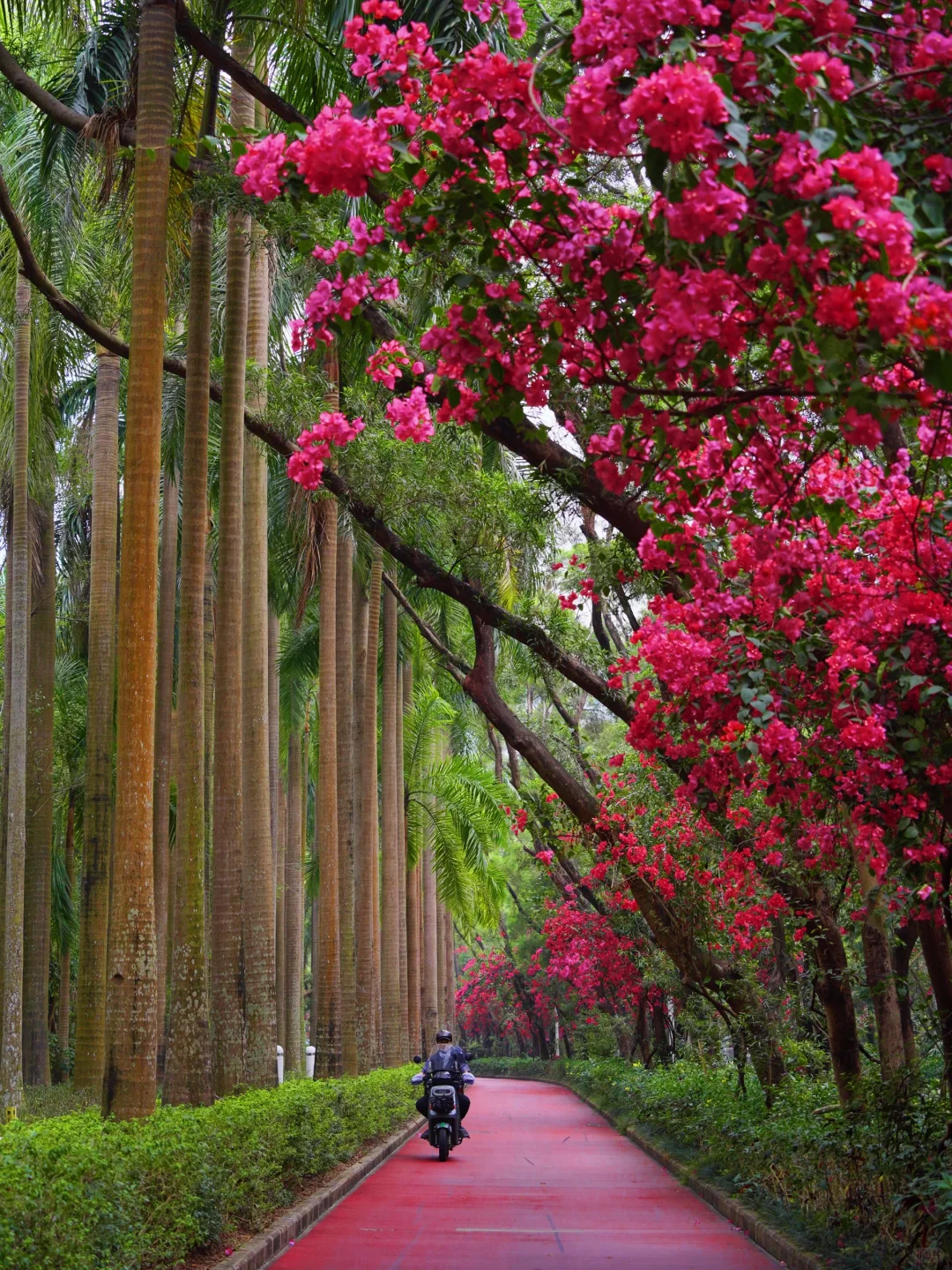 打卡过钻石大厦,再去走“花路”,几公里的路旁都是老树新长出的萌叶,三角梅在这里盛开,形成了一路生花的景象。又像是绿野仙踪被红色花海点缀,活脱脱大自然神奇的调色盘,在这里散步真的会浪漫到哭!🎨