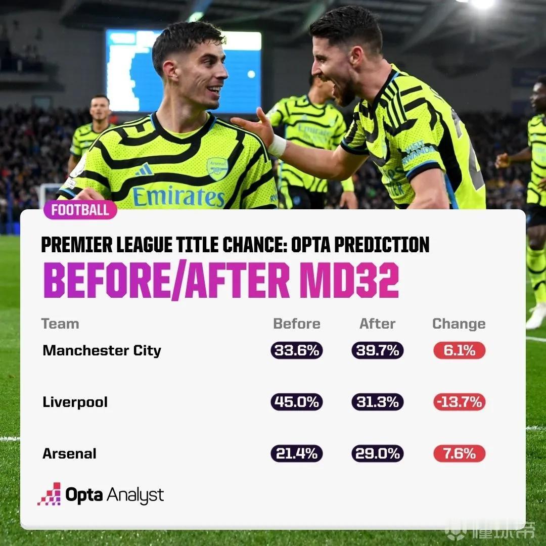 英超最新夺冠概率: 一、曼城39.7% 优势:1.赛程最好,除对热刺那场有难度以外,其他不出意外能全赢。 2.争冠经验丰富,擅长后程发力。 劣势:1.如果和阿森纳同分,净胜球和直接交手成绩不如阿森纳。 2.目前落后其他两队1分。 二、利物浦31.3% 优势:1.不用打欧冠,欧联相对轻松。 2.赛程比阿森纳稍微好一点。 劣势:1.赛程明显不如曼城好打,除了也要对热刺,客战埃弗顿和维拉都是硬骨头 2.板凳深度为三队里面最差,对弱队不如曼城稳定。 三、阿森纳29.0% 优势:1.目前积分榜第一,净胜球和直接对赛成绩均为三队中最好。也就是说只要三队同分,就是阿森纳冠军。 2.近况状态最好,人员也比较整齐。 3.20年没拿过英超冠军,英超需要新冠军加强热度。 劣势:1.赛程地狱般的难度,除了客战热刺和曼联非常难打,主场对切尔西和维拉也有失分可能。 2.球队有赛季末端崩盘的传统。 3.球队需分心欧冠,相对于联赛来说,欧冠夺冠可能性更大。