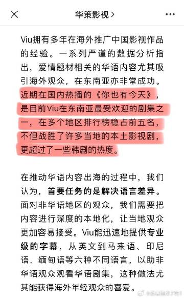 陈星旭的《你也有今天》在国外播的好好 “近期在国内热播的《你也有今天》,是目前Viu在东南亚最受欢迎的剧集之一,在多个地区排行榜稳占前五名,不但战胜了许多当地的本土影视剧,更超过了一些韩剧的热度” 陈星旭扛剧牛🐮