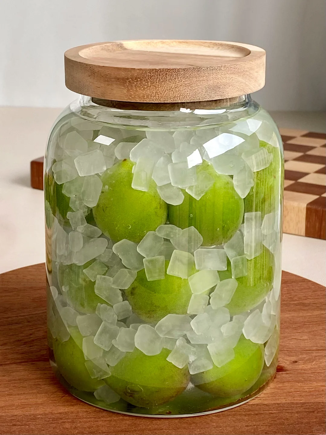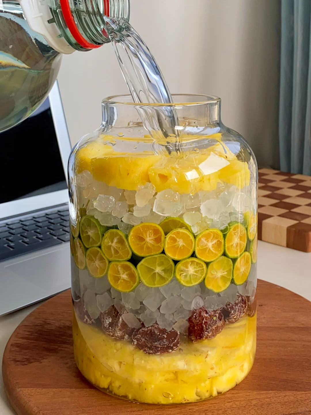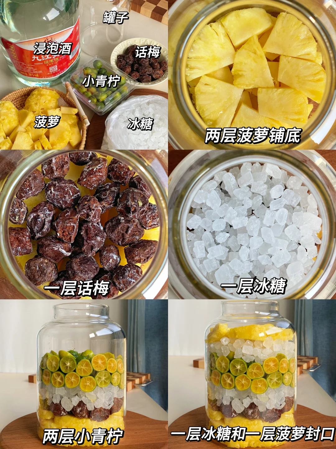 2⃣️密封罐清洗擦干,放入两层菠萝➡一层话梅➡一层冰糖➡两层小青柠➡️一次冰糖一层菠萝封口,装至7分满,倒入浸泡酒至9分满,盖好盖子密封避光保存!