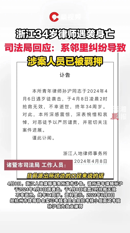 据了解,被害人是在浙江某律师事务所工作的男律师,名叫孙某,今年才34岁,事发在4月6日。但不幸的是,被害人孙某于4月8日经抢救无效后死亡。