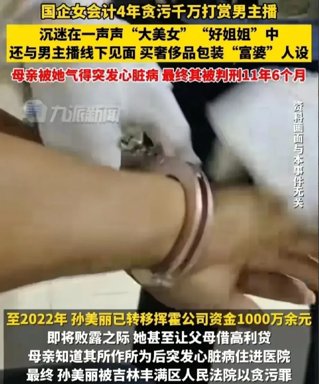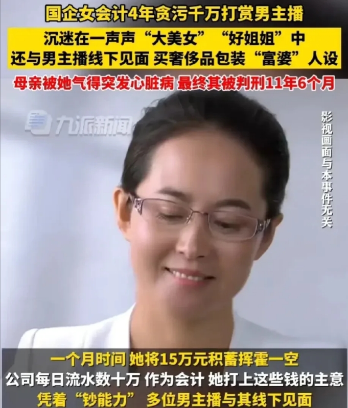 吉林省吉林市,一女子有家室,在国企担任会计。可是女子却迷上了男主播,为了让男主播叫自己“大美女”和“好姐姐”,竟然在四年的时间里,贪污公司1000万余元,而且将这些钱全部用来打赏男主播。眼见事情将要败露,竟然让父母借高利贷。母亲因此气得突发心脏病。女子最终因为贪污罪,被法院判处有期徒刑11年6个月。