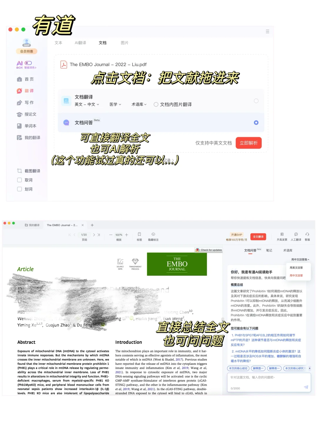 点击文档把文献PDF拖过去,直接可以进行文档翻译or文档问答(可选择医学领域),文档翻译就是将一整篇文章自助翻译成中文(个人不推荐这个),可选择文档问答。