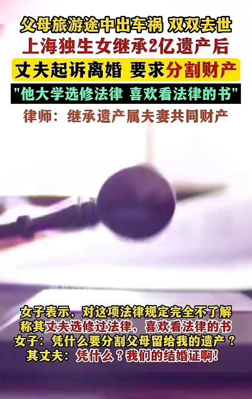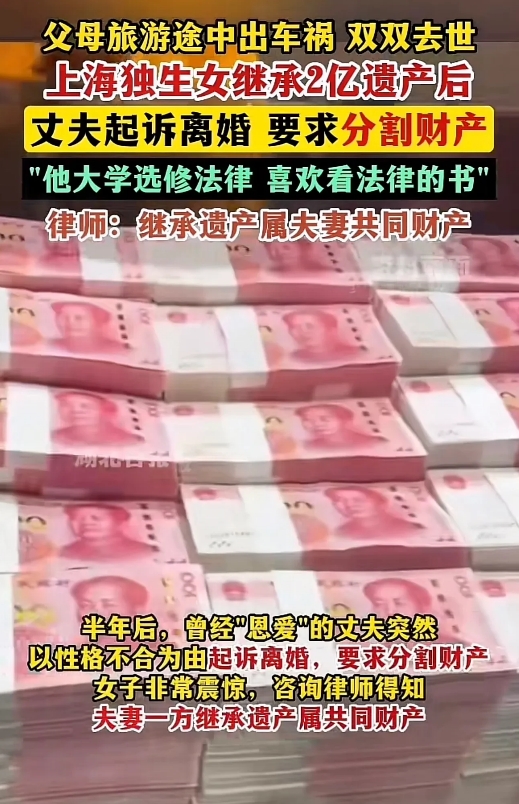 上海,一富家独生女,与一酒店男服务生相识,服务生对女子展开热烈追求,两人结了婚,婚后1年,女子父母因车祸去世,留下价值2亿的9套房产和商铺!岂料,丈夫却突然向她提出离婚,还要求分割夫妻共同财产1个亿! (来源:南方周末)