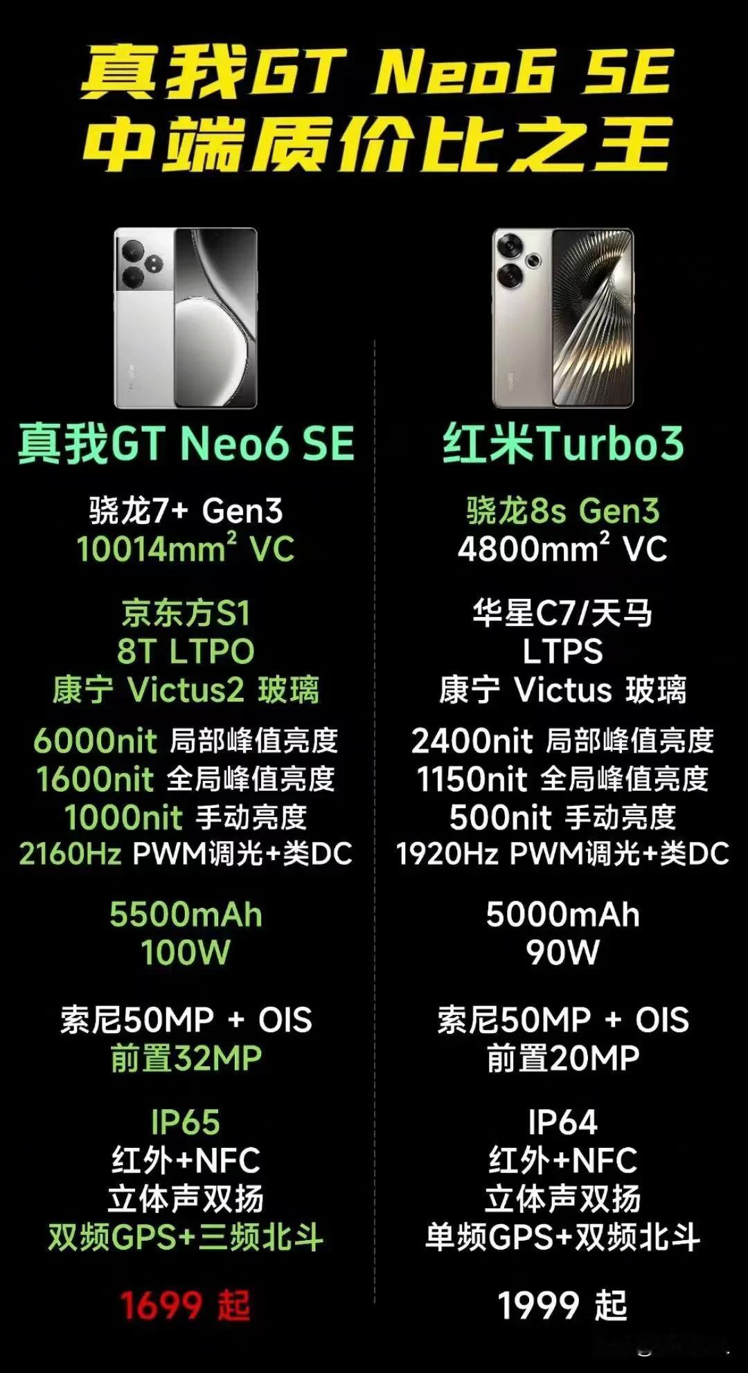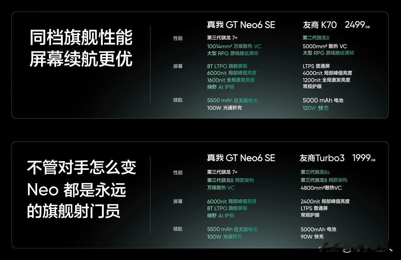 内卷一直是中端智能手机市场中的大戏,性价比一也直是消费者关注的热点。今天早上,真我GT Neo 6 SE 正式发布,对标正是昨晚发布的红米Turbo 3。两款产品市场定位、价格方面极其相似,那真我GT Neo 6 SE的优势点有哪些呢??? 屏幕上,真我GT Neo 6 SE最高6000nit局部峰值亮度,手动亮度1000nit。真我GT Neo 6 SE在屏幕方面的优秀表现,无疑能更好地满足消费者对户外、亮光等使用环境高质量显示效果的需求。 续航能力上,真我GT Neo 6 SE配备了一块5500毫安的大容量电池,同时支持100W的快充。确保了用户在外出或长时间使用时都能有足够的电量支持。 售价上,真我GT Neo 6 SE 1699的定价无疑是对红米Turbo 3的有力挑战。特别是在真我GT Neo 6 SE部分功能性参数更突出时,实际购买决策中,更能成为消费者权衡的一个重要因素。 综合来看,对比红米Turbo 3,真我GT Neo 6 SE在价格、屏幕和续航方面都展现出了明显的优势。但是红米Turbo 3凭借高通骁龙8s Gen3也展现了强大核“芯”竞争力,另外其背后的小米生态链、以及品牌等,也为它提供了不小的竞争力。