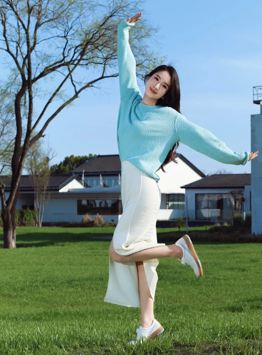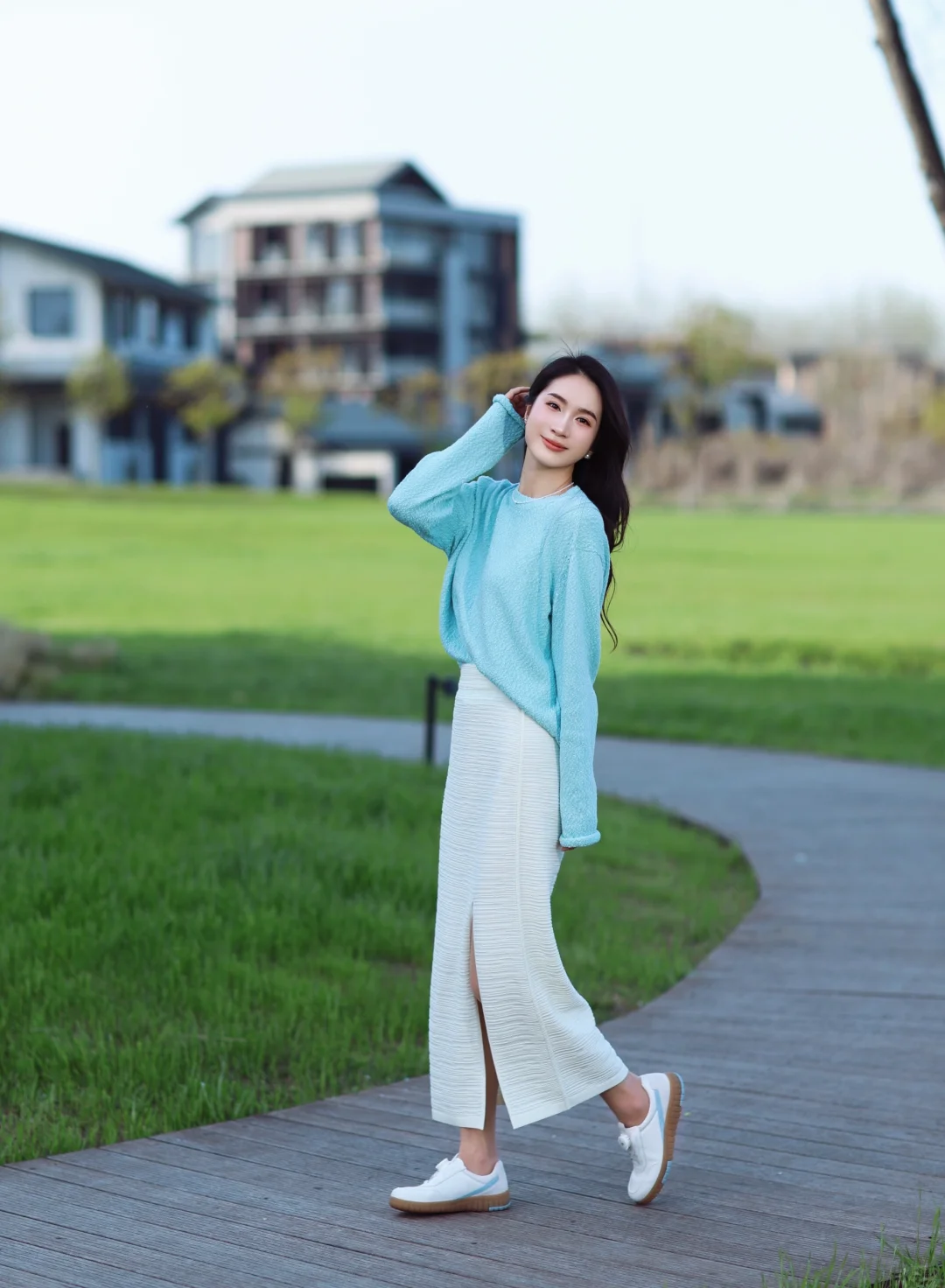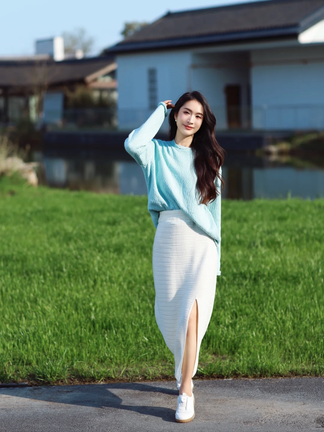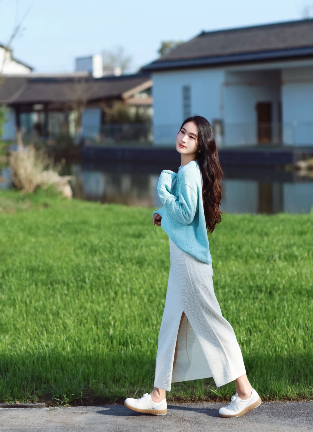 薄荷绿简直就是春天的标配色 搭配开衩半裙和小白鞋 春天休闲气息再也藏不住🌸