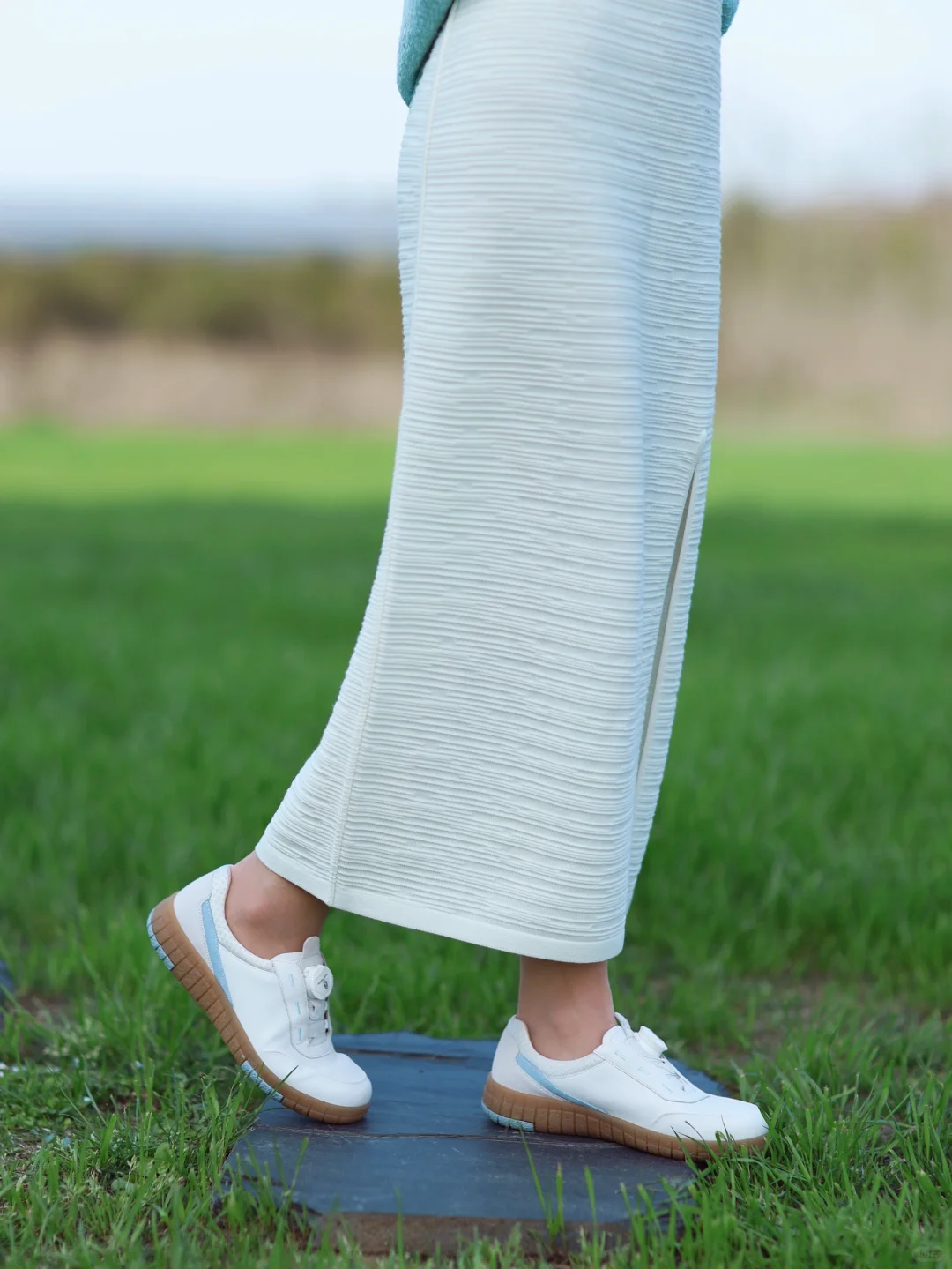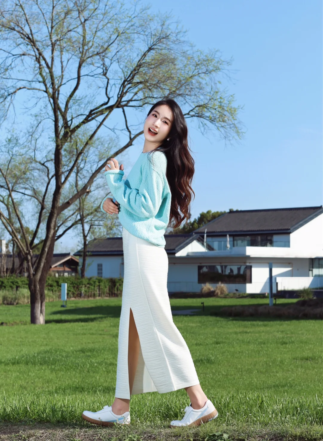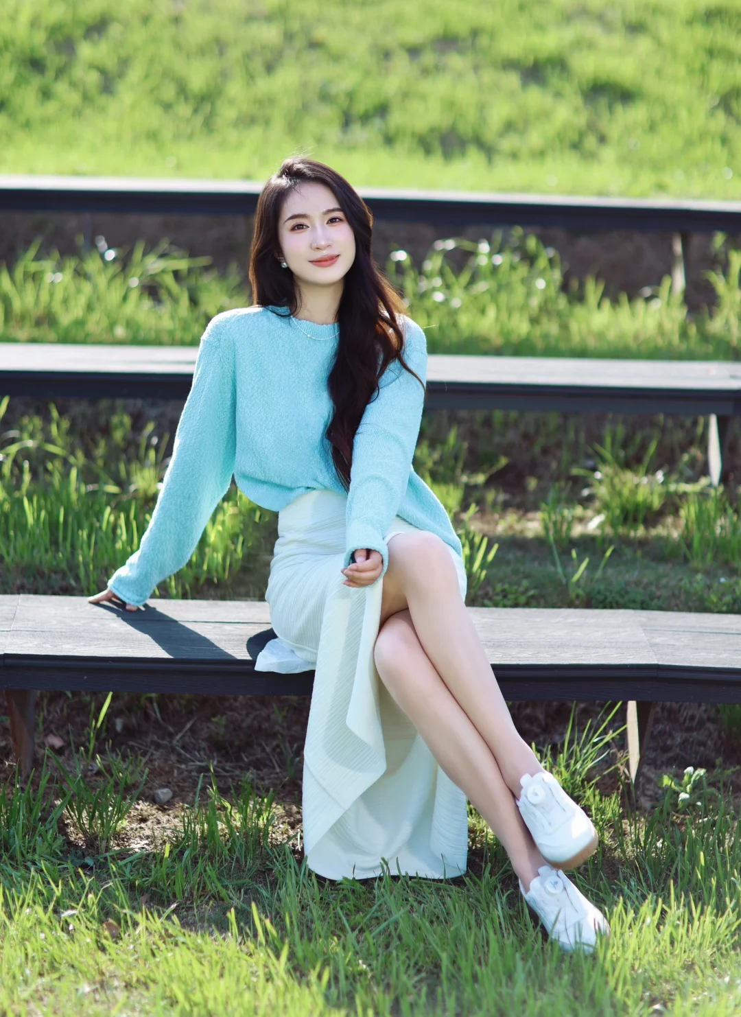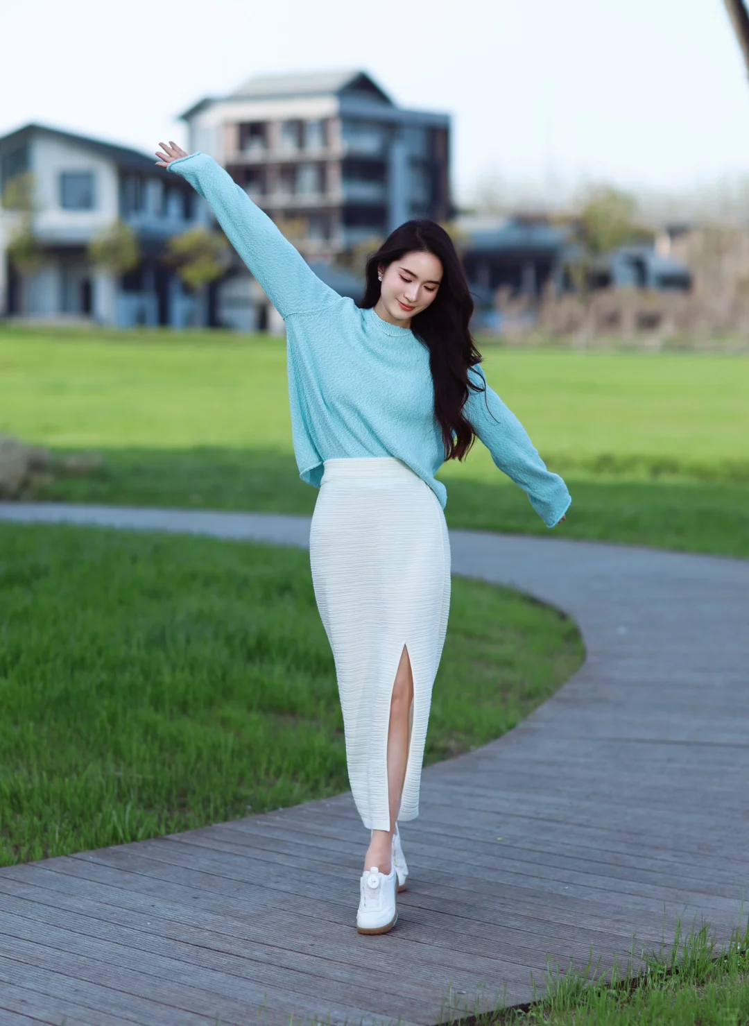 薄荷绿简直就是春天的标配色 搭配开衩半裙和小白鞋 春天休闲气息再也藏不住🌸