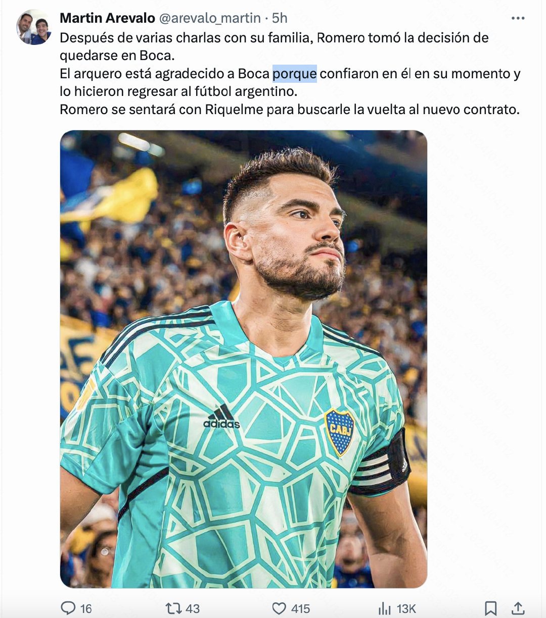 “在与家人进行了几次讨论后,罗梅罗决定留在博卡。