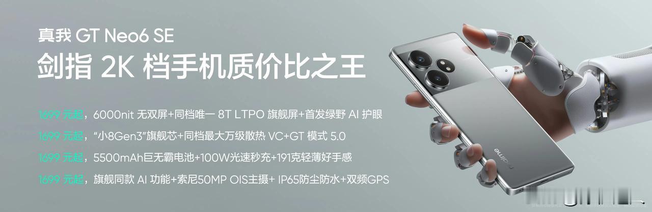为什么真我GT Neo6 SE发布之后,我说它是最值得购买的中端机,没有之一。 真我GT Neo6 SE标配6000nit的新一代无双屏,内置5500mAh电池,支持100W有线闪充,续航持久,回血迅速!除此之外,双扬声器、X轴马达、红外和NFC等功能都是标配,而且主流的AI功能也都支持。 相比竞品,无论是屏幕、续航、质感,双频GPS,还是防尘防水都比同档位高了一个档次。这次首销在京东购买还可以享受365天只换不修。 综上所述,真我GT Neo6SE产品力还是相当不错的。若你的预算在1500~2000,那选择真我GT Neo6 SE性价比真的非常不错!