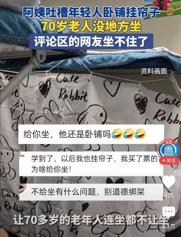 还有人说,她的意思是,坐人家的下铺,睡自己的上铺,不给她坐就不行。