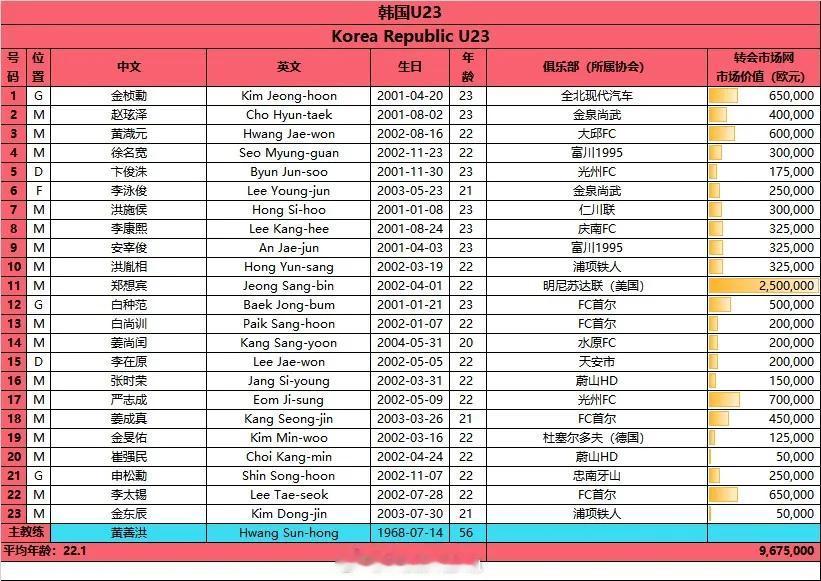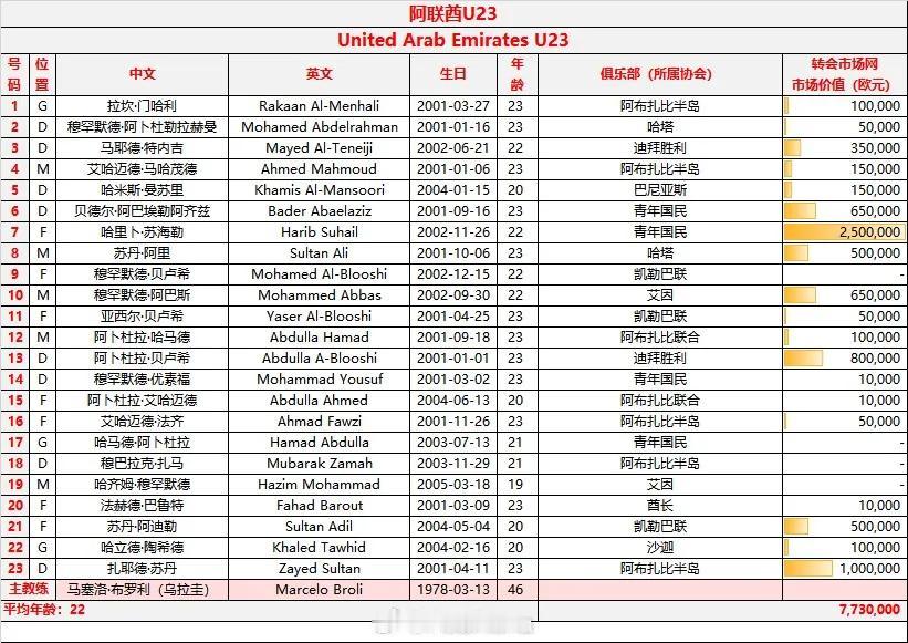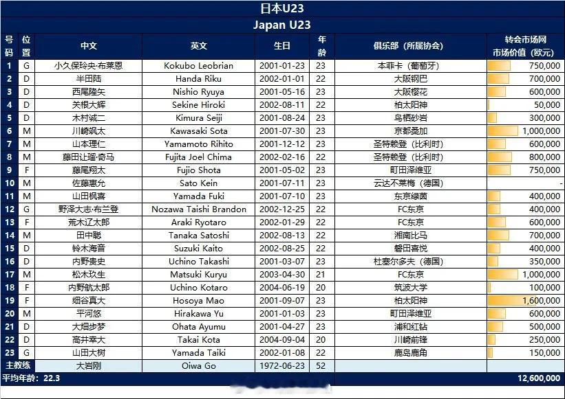 U23亚洲杯中国队所在小组最新身价排名 1.日本队1260万欧 2.韩国队967.5万欧 3.阿联酋队773万欧 4.中国队287.5万欧 本来就是小组身价垫底,还伤了身价最高的木塔力甫[捂脸]