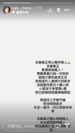 张致恒屋企被Cut电求助 雯雯感谢有心人帮忙:唔介意你话我乞儿 张致恒(Steven)与太太区燕雯(雯雯),近年一直不时在社交平台自爆「财困」及「婚变」,昨日(16日)又有突发情况,雯雯怒吼被Cut电:「已经唔系容忍嘅范围之内。」而张致恒同日在IG限动上载了电子钱包的QR Code,并加上句子「已经谂去到唔到办法」、「求助」。 雯雯今日(17日)在IG宣布喜讯,表示目前困境已经安然度过,写道:「多谢真正有心嘅所有人,多谢真正帮过我哋嘅人!寻晚零晨已经一切安好,我唔介意你话我乞儿我相信冇人会想行到呢步但经历完寻日十几小时,小朋友不幸发烧+呕。我已经得到我应得嘅教训,我唔系工作都冇钱而系啱啱起步,未足一个月,所以而家仲系零。多谢真正关心我哋嘅人,亦多谢闹我哋嘅人,发生嘅我已经有足够嘅惩罚。」 另外,早前雯雯曾疑因压力爆煲而发表言论,并指「有一个仔确诊autism plus hyperactivity 」,因而引来极大回响。早前雯雯在IG限时动态发布千字文,透露家中发生不幸事件,不但狗狗生病,其中一个仔仔患上自闭症,更有过度活跃的症状,更意外跌爆耳朵,令她在照顾上心力交瘁。这番言论惹来误会,令张致恒与雯雯日前(15日)於IG发文澄清,大仔5岁冇自闭,写道:「我想澄清番天宝系冇自闭」。#春日生活打卡季#