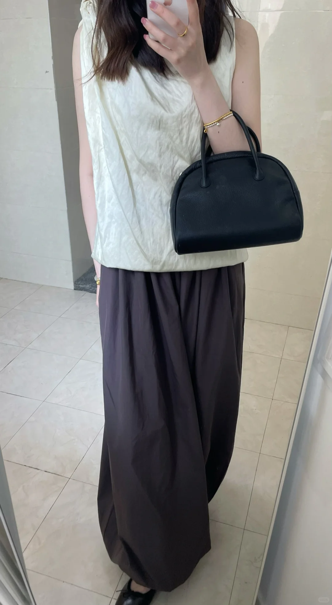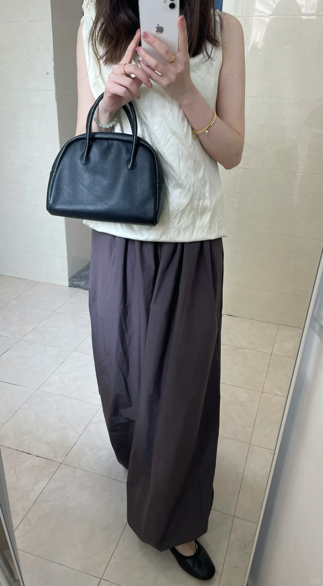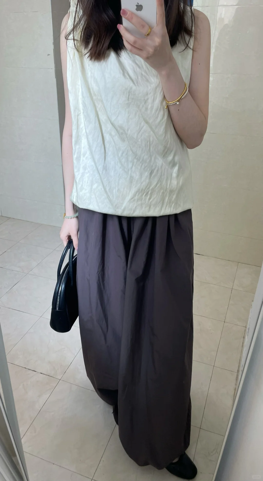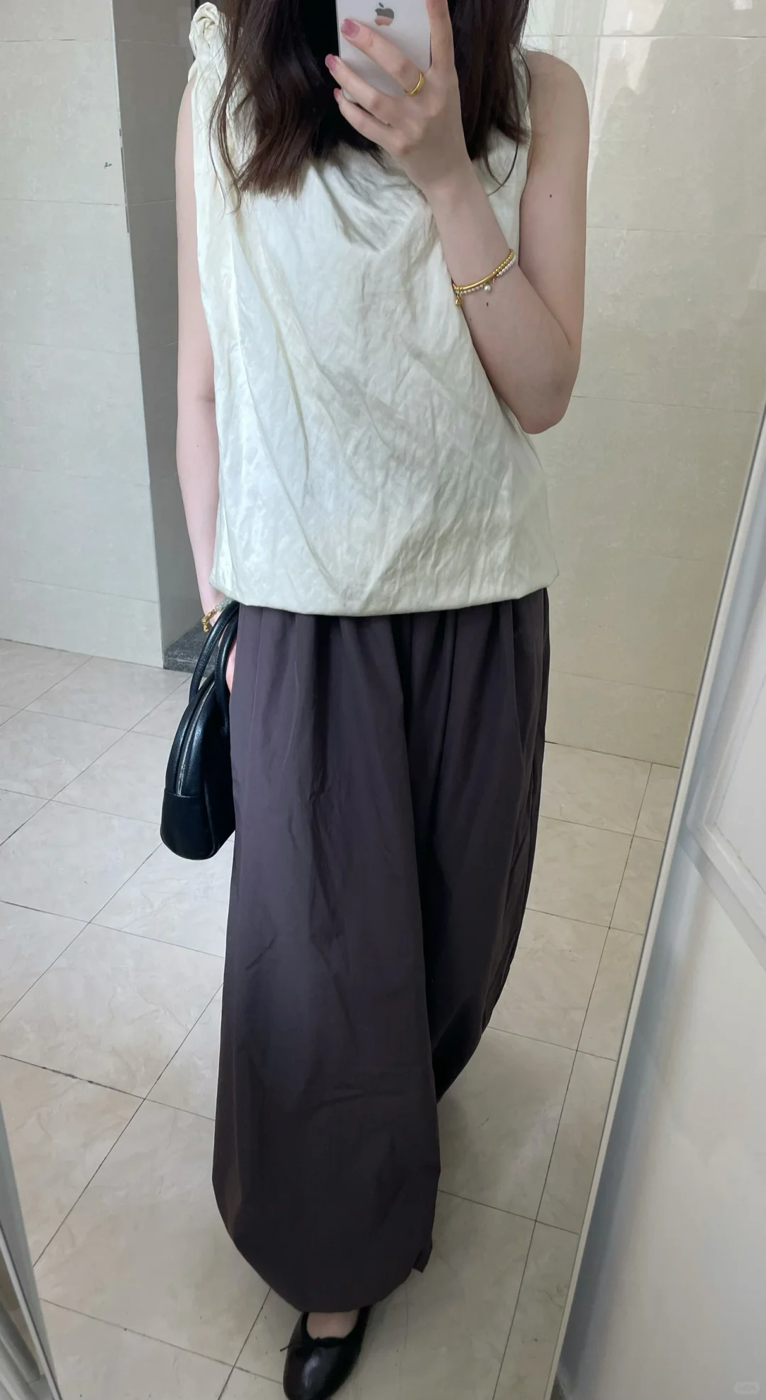 面料好穿透气 小个子会有点拖地 我的方法是把裤腰那里折一圈进去 这种有松紧的小脚裤配芭蕾鞋也好好看!