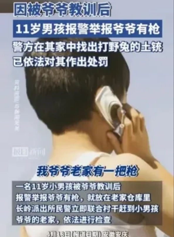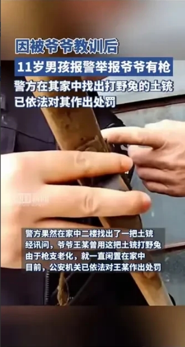 安徽安庆,一名11岁的小男孩因为受到了爷爷的训斥,于是就报警举报爷爷家里藏有一把猎枪。警方赶到小男孩爷爷家,发现果然有一把土铳。警方对小男孩的爷爷进行了处罚。