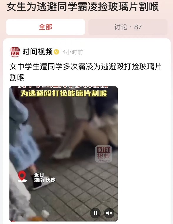 必须严惩,湖南长沙,网传一名女初中生被同学多次殴打、霸凌。事后女学生为避免被殴打,竟捡起玻璃片割伤喉部。现场视频显示,女学生躲在窗户角落时,被两名女同学轮流不停扇耳光。另一段视频则显示,女学生坐在地上时,被一群人拳打脚踢、期间还有人踢向女学生的头部。据了解,女学生已经被打得遍体鳞伤。目前,女学生家长已经报警求助。主管部门工作人员则回应称,已在调查核实。