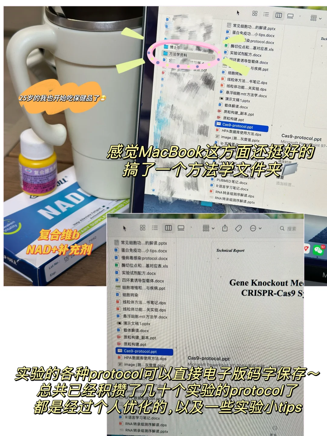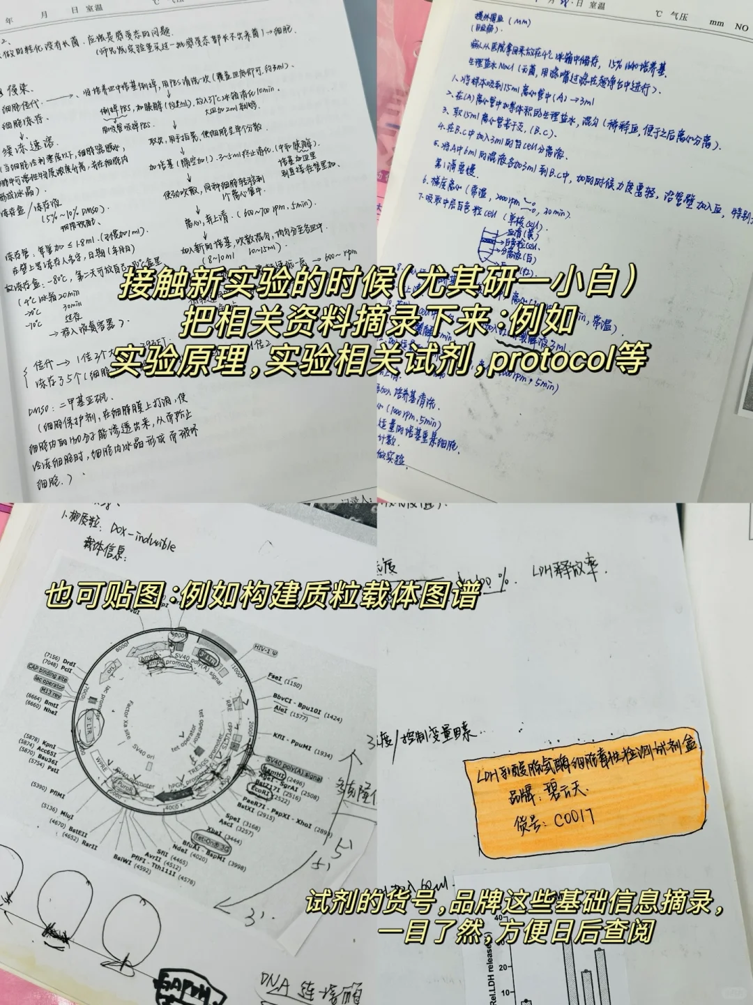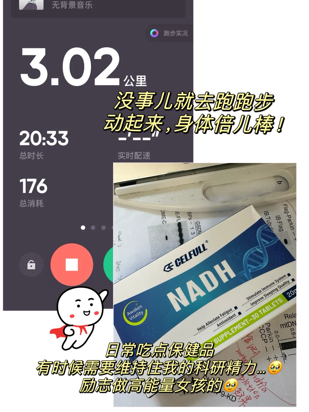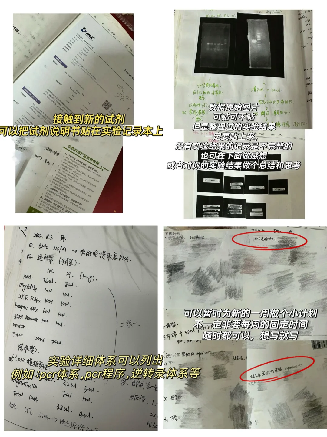 不知自己哪来的牛劲一边疯狂做实验,一边还能写这么多字的,我都快佩服自己了[皱眉R] 目前为止写了9本科研记录了😂实验protocol 个人是整理在电脑上的,但是日常科研的随手记录写在本上。[大笑R] 今天分享下自己如何写科研记录的😇 ✅1、接触新实验时写清楚相关信息,步骤,原理等,之后再接触此实验就不用写太详细,一笔带过即可。 ✅2、实验所用的试剂:名称,品牌,货号标记清楚,后面方续查阅。 ✅3、头脑风暴:可以撰写自己对实验的想法和计划。例如:新的一周实验计划,再逐步分到每一天中,合理安排,顺便也能整理一下自己的思路。 ✅4、可以用🔢数字罗列自己每天做的事情,然后数据结果图附在后面。 ‼️5、最重要的部分:实验结果!完整的科研记录一定有实验数据结果📊。例如western,把原始图片和整理后的figure贴在本上。 ✅6、失败的实验数据可以写,并分析其可能原因,之后着重注意。 ✅7、实验涉及到的计算和体系等方面摘录下来,例如:MTT实验,加药等。 ———————————— 🌟个人小记: 经常会有宝跟我说读研很累,本人虽然精力算充沛但有时候也会感觉力不从心…各位硕博生真的要注意身体!!![叹气R] 好的身体可以带来无限的能量~ 我研一下学期的时候生了一场大病,永远记得导师那句“别治病了!治不好!干啥啥不行”那恶狠狠的眼神… 我毅然决然请假一个月回家养病,回来以后疯狂运动不敢熬夜,补维b补钙,为了更好的照顾自己,最近新入了一款NAD+补剂【赛立复力活元】,它主要成分是NADH,🉑直击K衰老根源,提升体内NAD+水平和清除氧化自由基!偶尔科研精力不足时就吃这个,放到工位旁提醒自己按时吃,精力真的恢复许多… 感觉慢慢状态回来以后,实验也没有以前那么不顺,实现了正循环➰,现在基本可以hold住高强度工作了~ 反正25岁的我已经开始惜命,运动➕早睡➕补钙➕补维生素➕吃保健品😅,不吃真的不行,明显感觉自己代谢不如年轻的时候了哈哈哈… 真的很适合我,科研人离不开补充能量的东西,前段时间感觉自己有点脑雾🌫️😭,会注意力不集中,总共阳了4回,可能和这个有点关系吧…