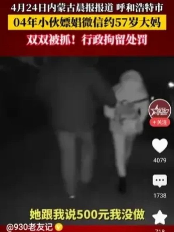内蒙古呼和浩特,04年小伙竟然鬼迷心窍,与57岁的大妈试图发生关系,可是两人却被警方当场抓获。小伙子交代说,大妈说要500元,小伙子觉得价格有点贵,就没有同意。双方因为从事违法活动,被警方处以行政拘留。