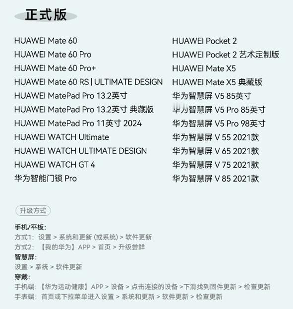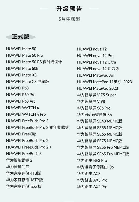 华为官方发布了HarmonyOS 4.2正式版升级计划,华为Mate 60、Pocket 2、MatePad Pro 13.2英寸、智慧屏V5、华为智能门锁 Pro以及WATCH Ultimate等22款设备今天起开启升级。具体详细机型,以及第二批升级设备(5月中旬)清单如图。