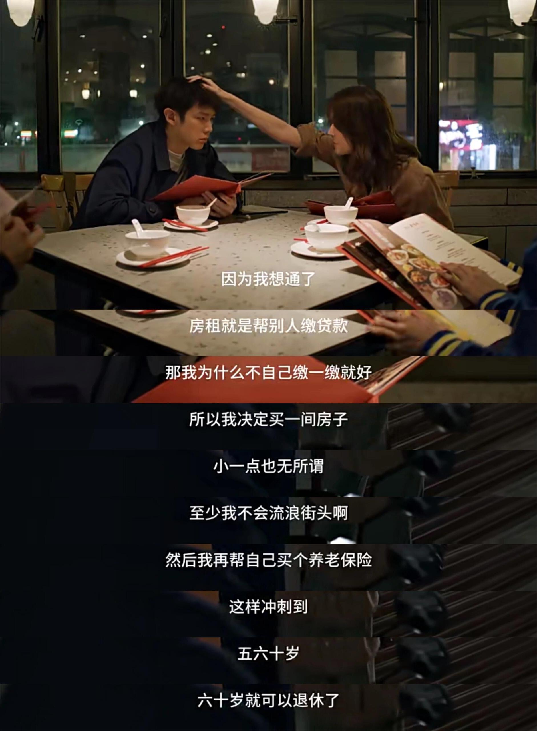 先是刘若英扮演的角色和瑞贝卡说人会老,钱会贬,四十岁之前是没有权利做喜欢的事的,我觉得有一些传播焦虑了,虽然她说的那些事确实是要做些准备,但我非常不同意说没有权利做自己喜欢的事,如果你只料想到自己只有一种结局,那人生也太没意思了